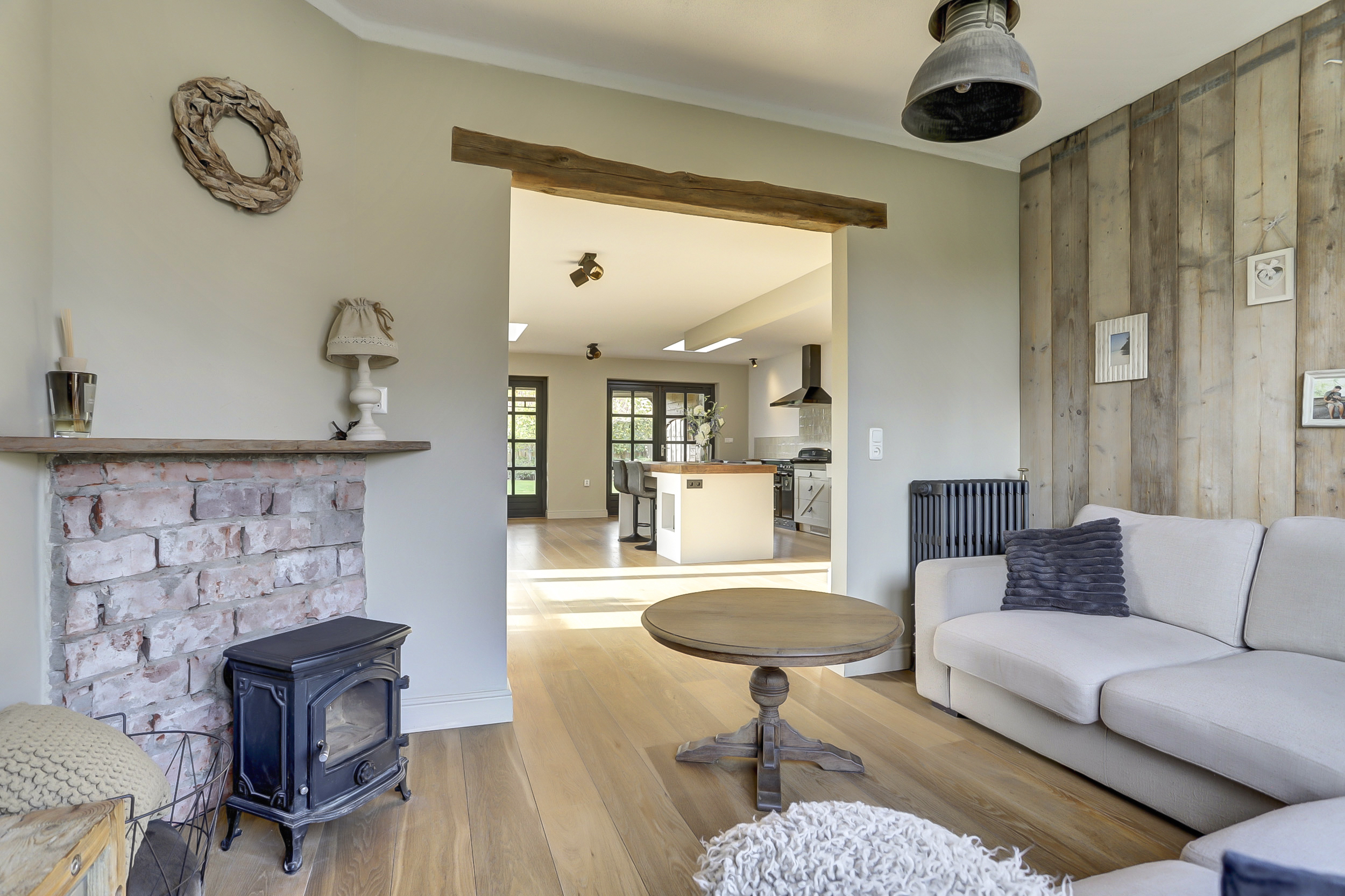 De lichte woonkamer heeft een warme uitstraling dankzij de eikenhouten vloer, gestucte wanden en een gezellige houtkachel. Grote ramen zorgen voor veel lichtinval en een prettige sfeer.