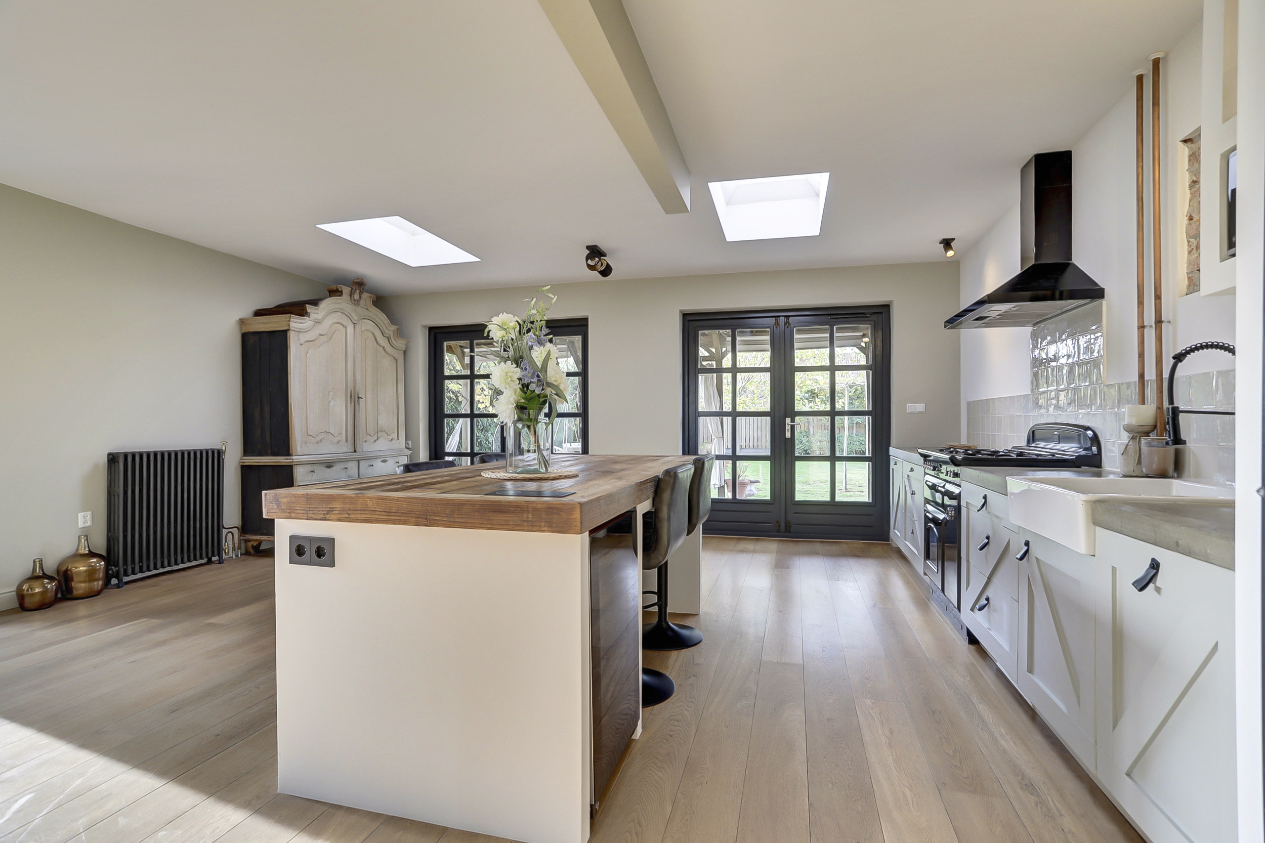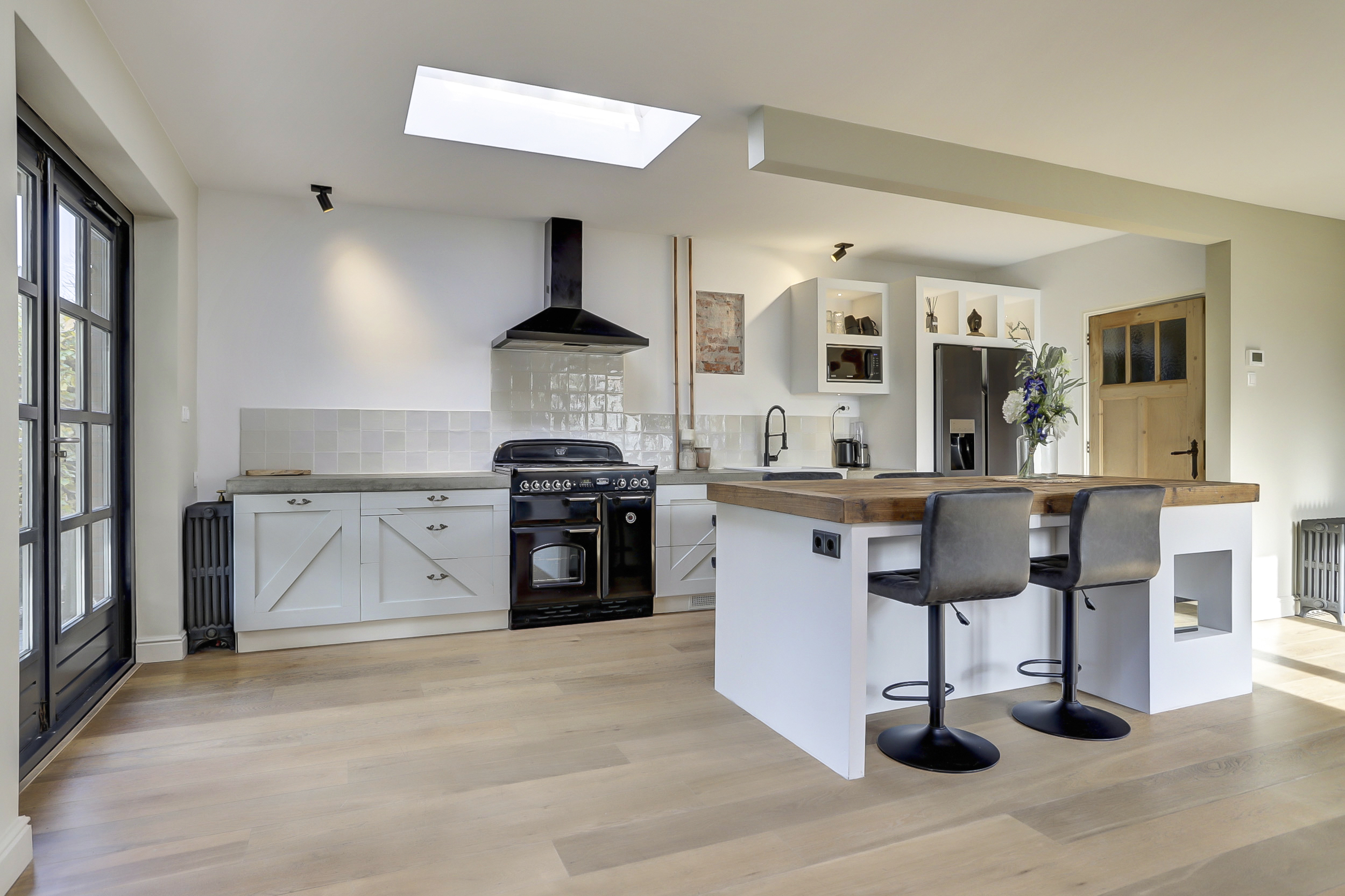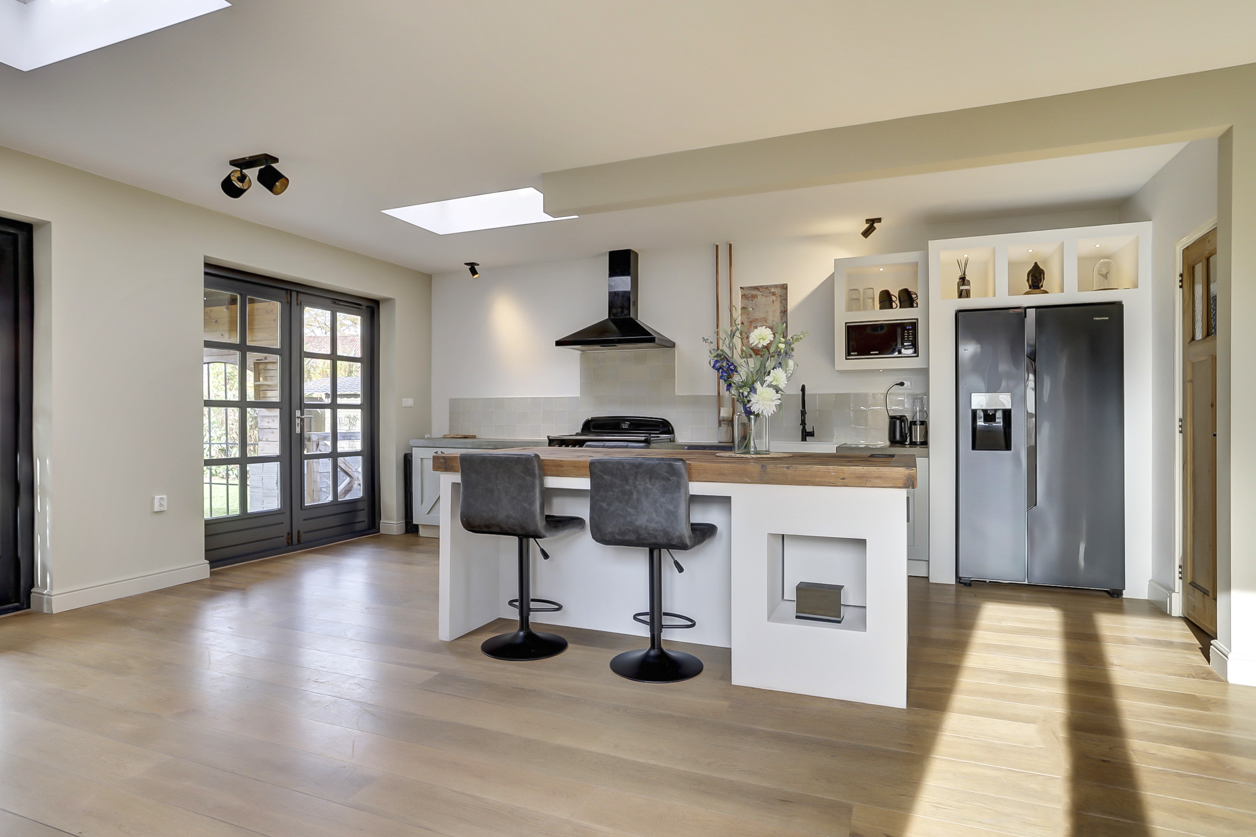 Aan de achterzijde is in 2013 een uitbouw gerealiseerd, waardoor een royale woonkeuken is ontstaan. De keuken heeft een landelijke uitstraling met een betonnen aanrechtblad, verzonken spoelbak met designkraan, een groot gasfornuis met oven, afzuigkap en een Amerikaanse koelkast., magnetron en wijnkoeler. Vanuit de keuken loop je direct de ruime overkapping op – een heerlijke plek om tot laat buiten te zitten.