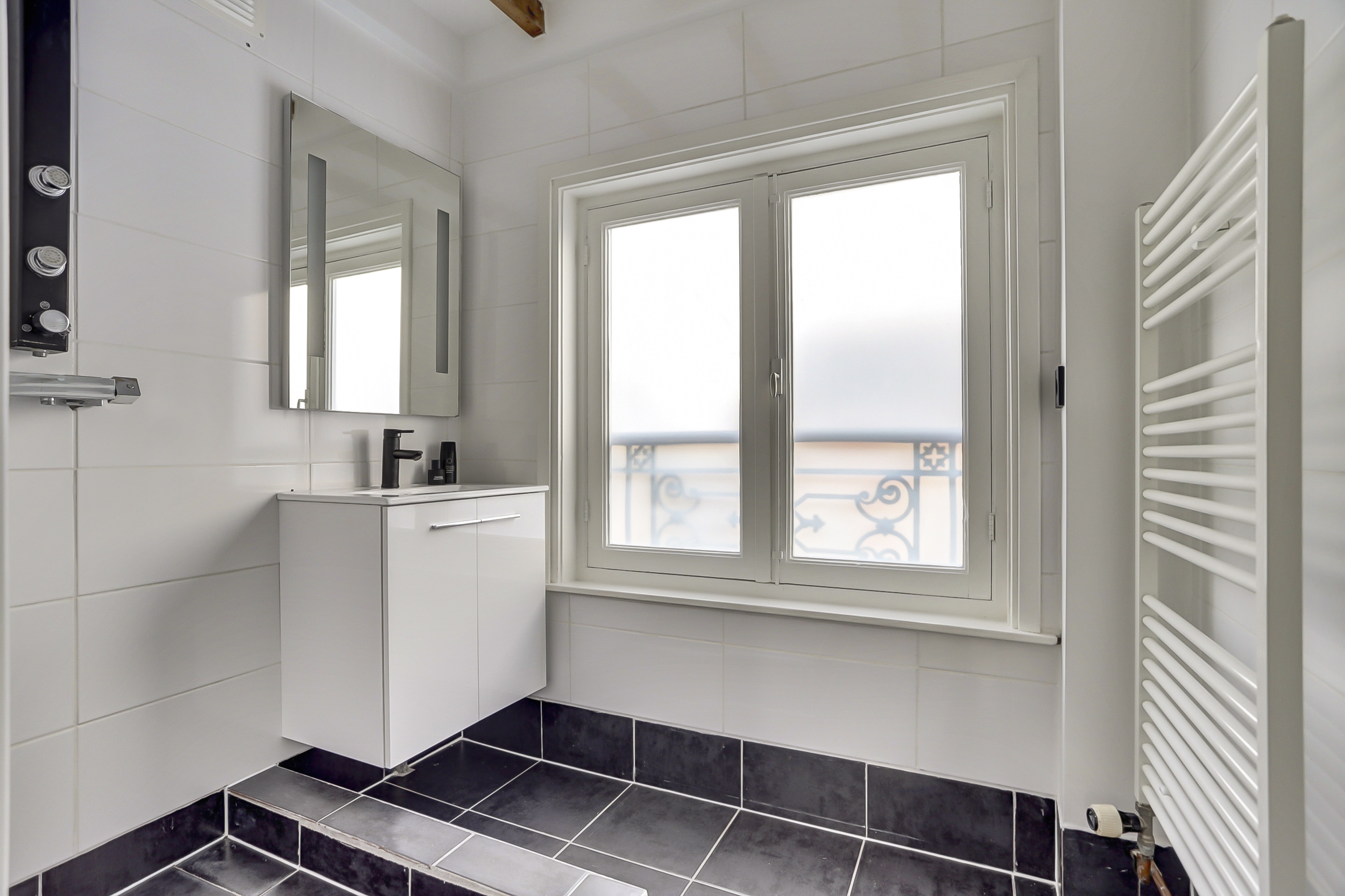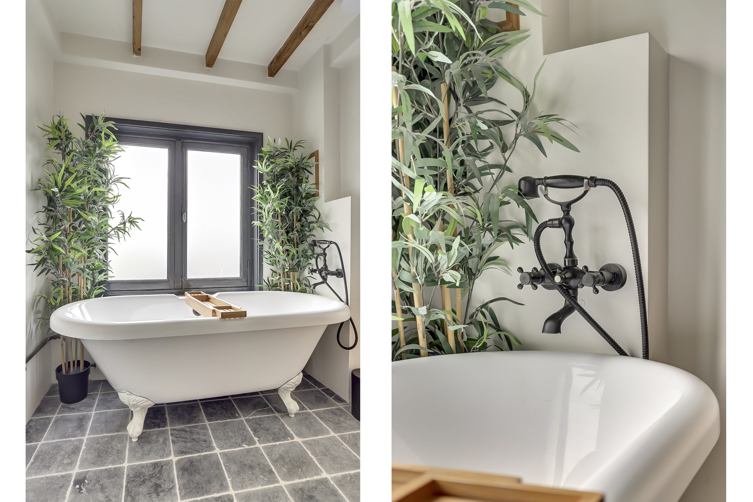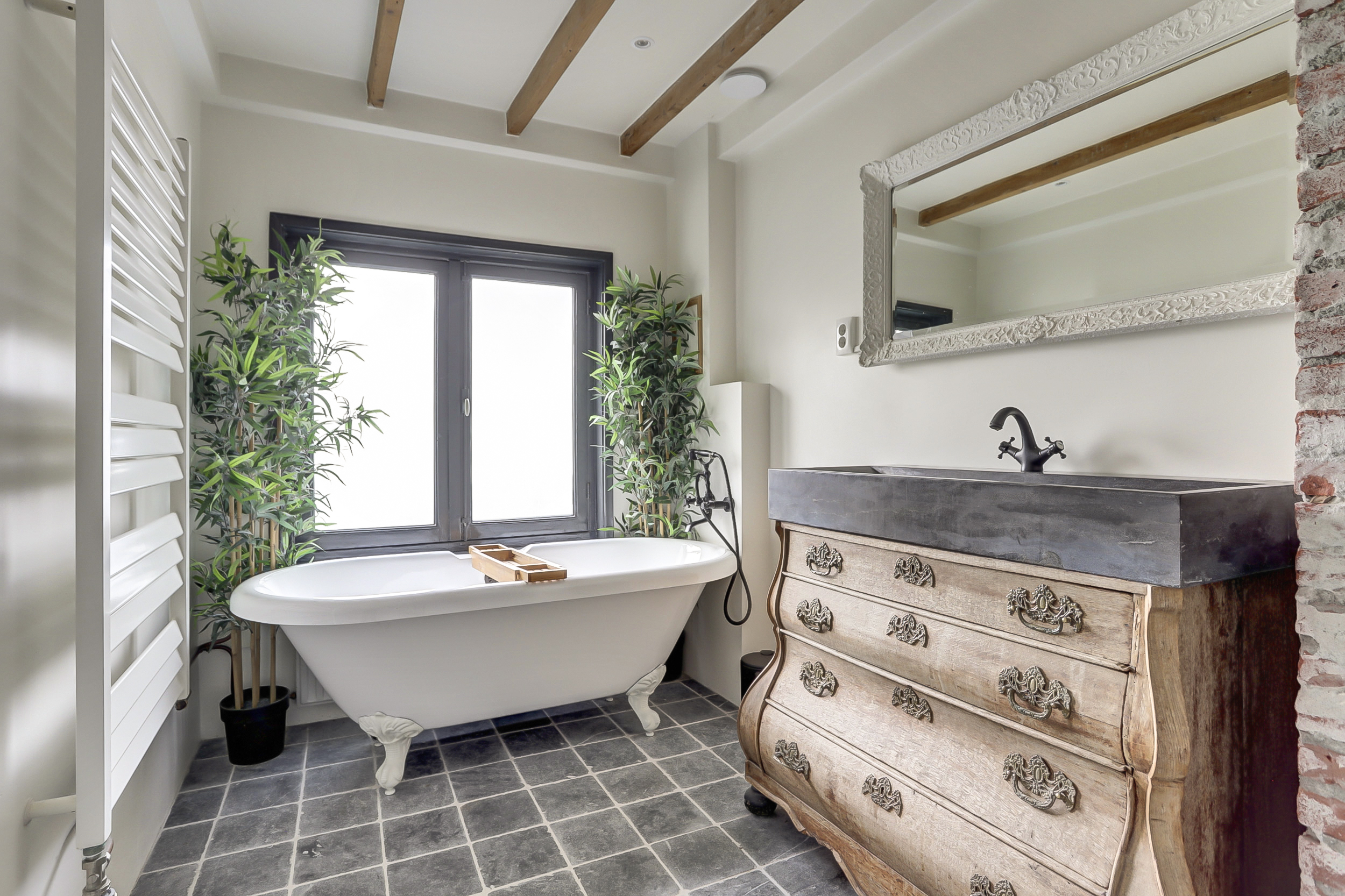 De badkamer heeft vloerverwarming en is geheel betegeld en uitgevoerd in Franse stijl met een stijlvol wastafelmeubel, spiegelverwarming een klassiek vrijstaand bad op pootjes en een douche met thermostaatkraan.