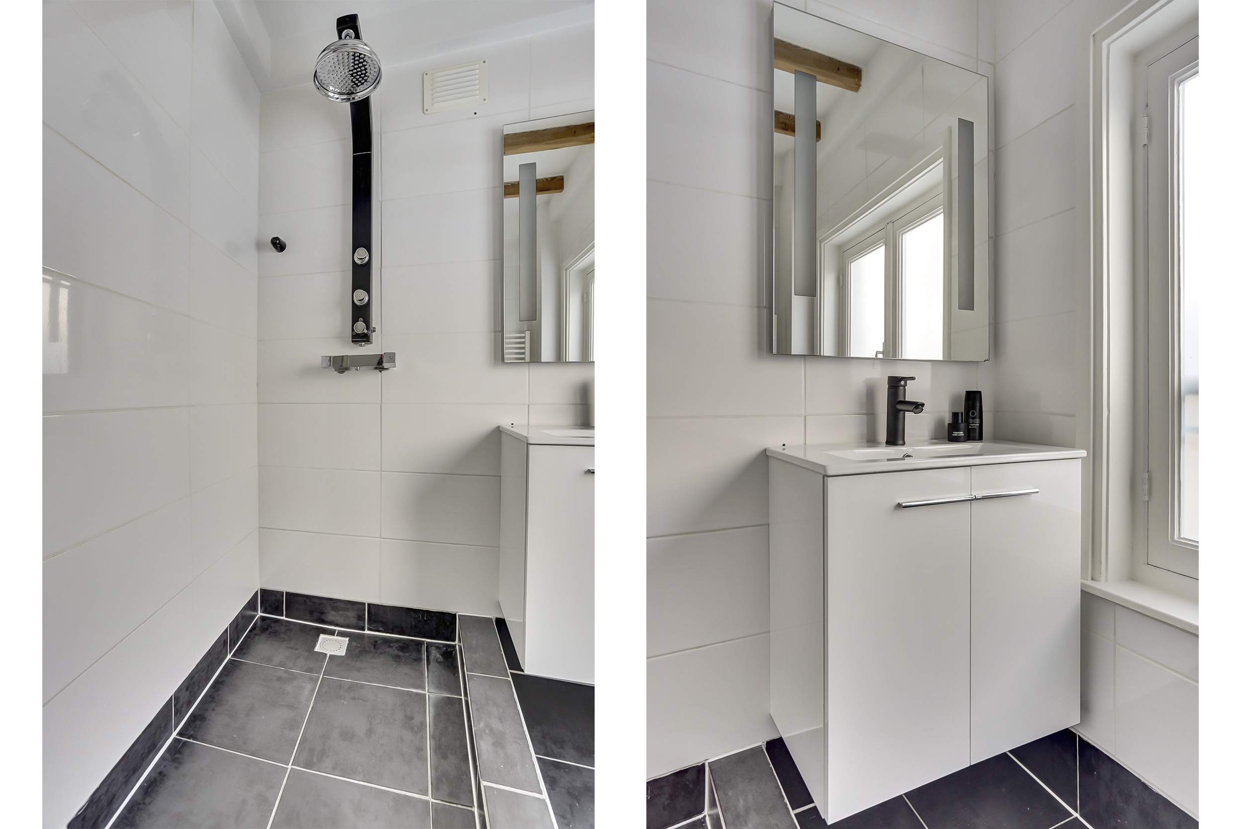 De aparte wasruimte is voorzien van een douche, tegelvloer en betegelde wanden. Hier is ruimte voor de wasmachine en droger, waardoor je alles praktisch bij de hand hebt.