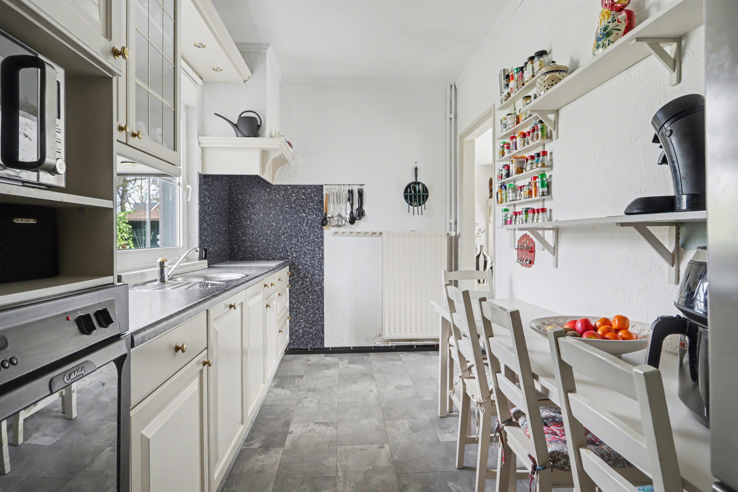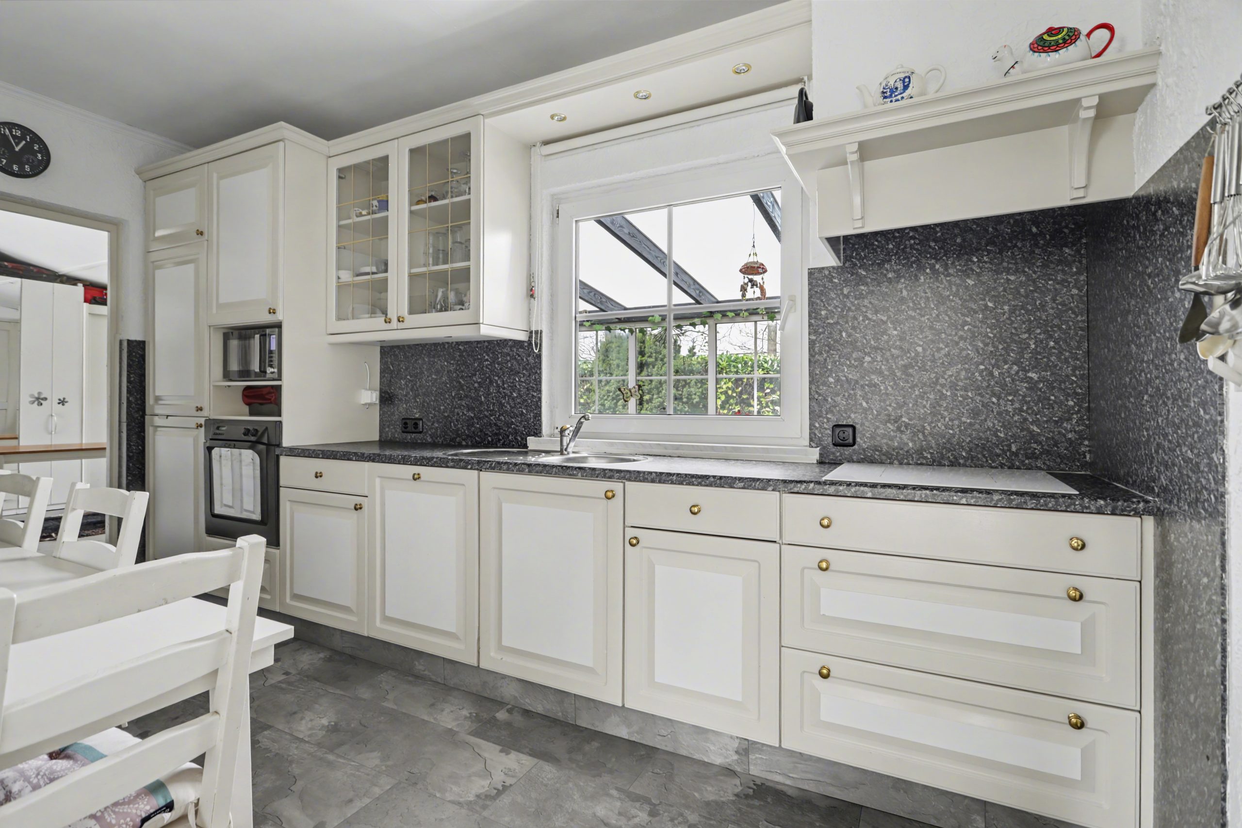 De ruime keuken beschikt over een praktische opstelling met diverse inbouwapparatuur, waaronder een inductiekookplaat, afzuigkap, koelkast, vaatwasser en oven. Vanuit het raam heeft u een fraai uitzicht op de tuin.