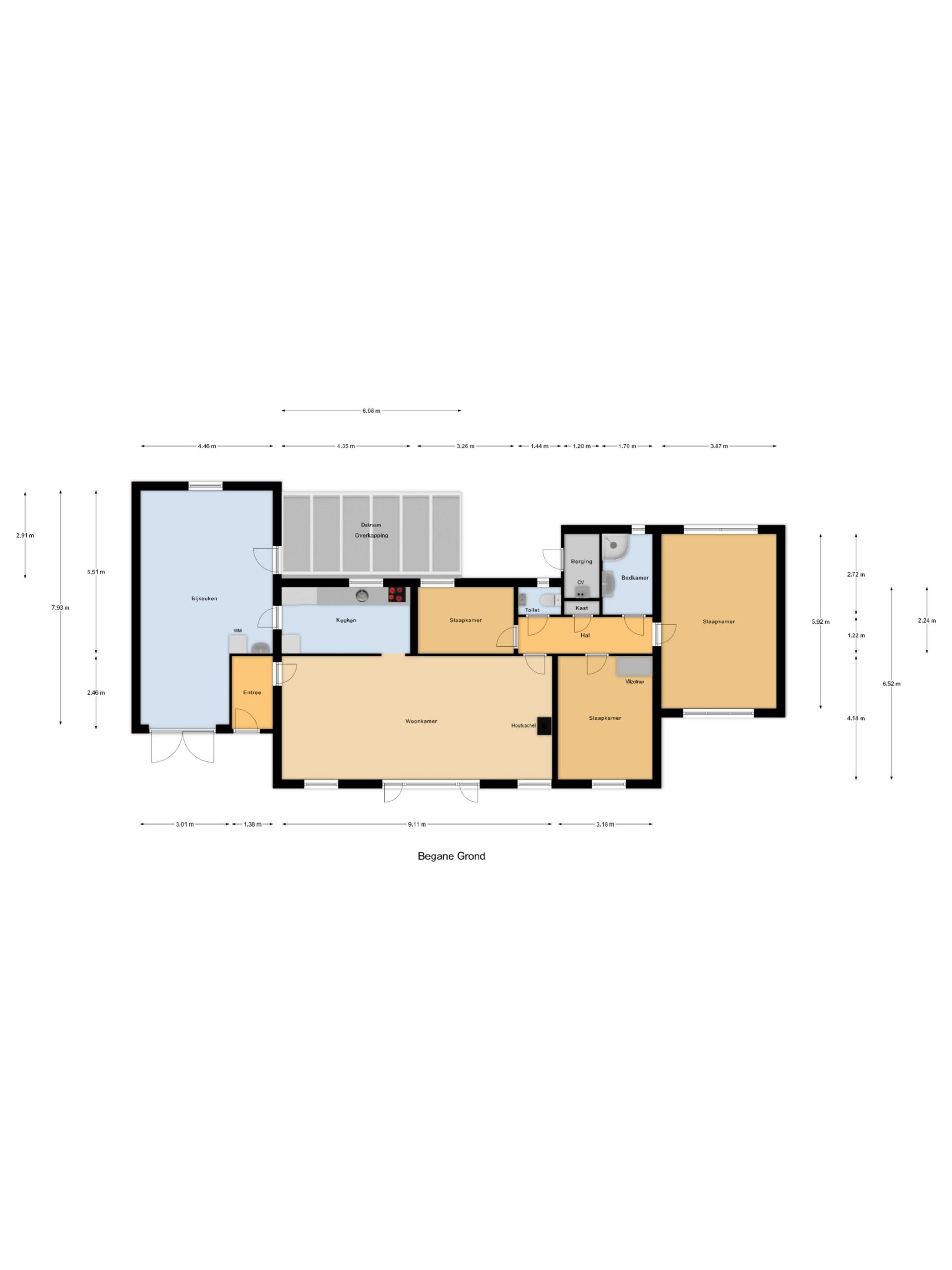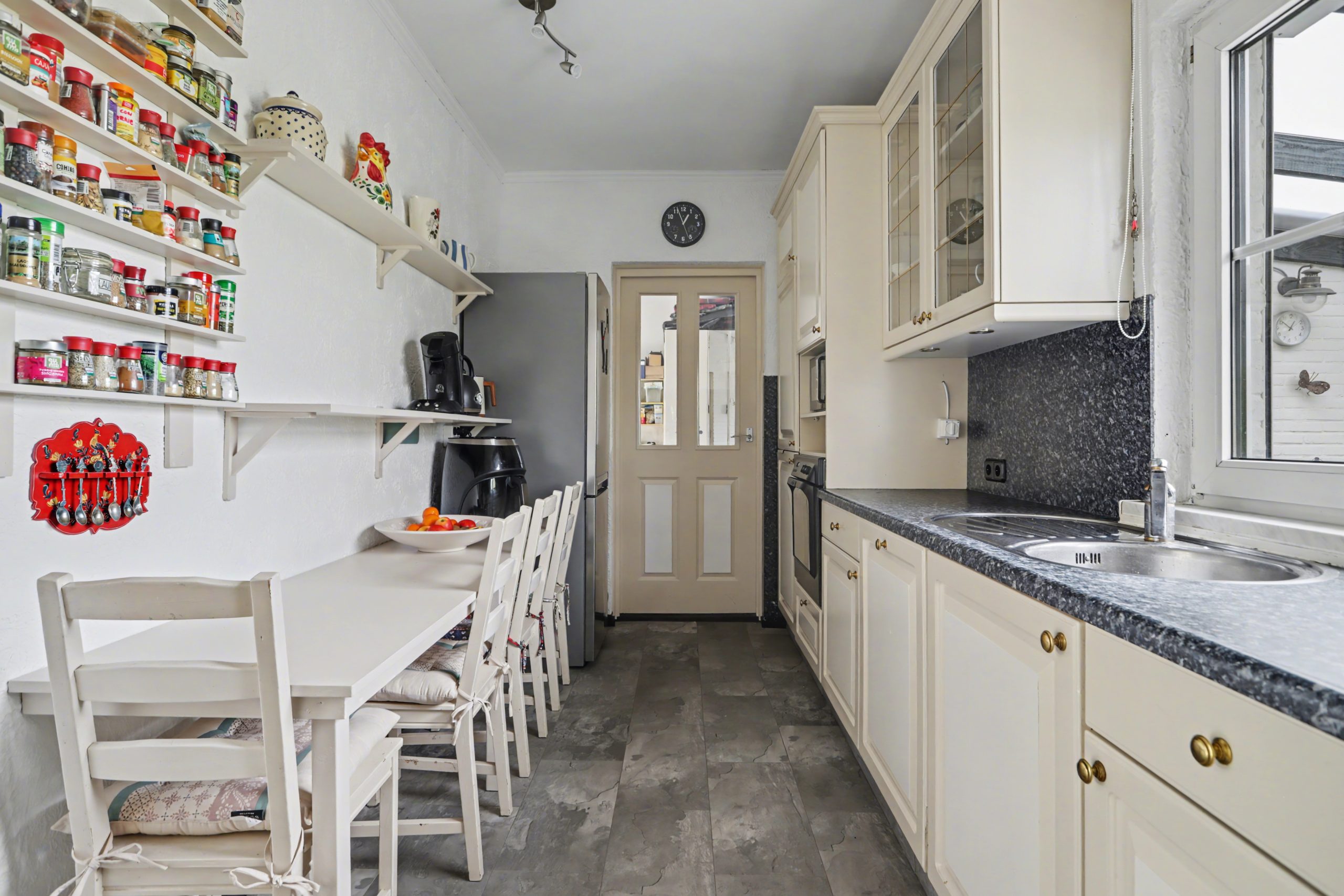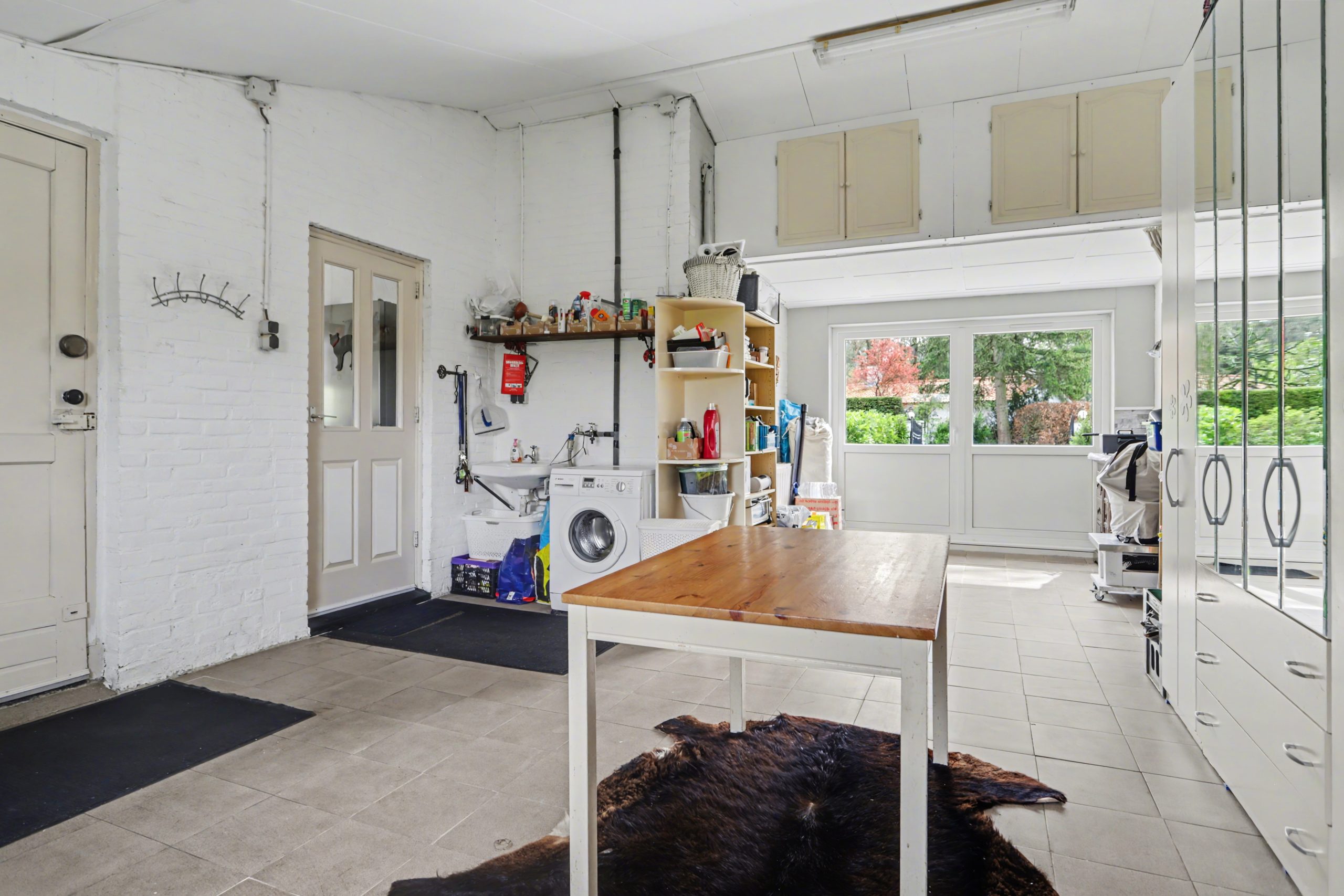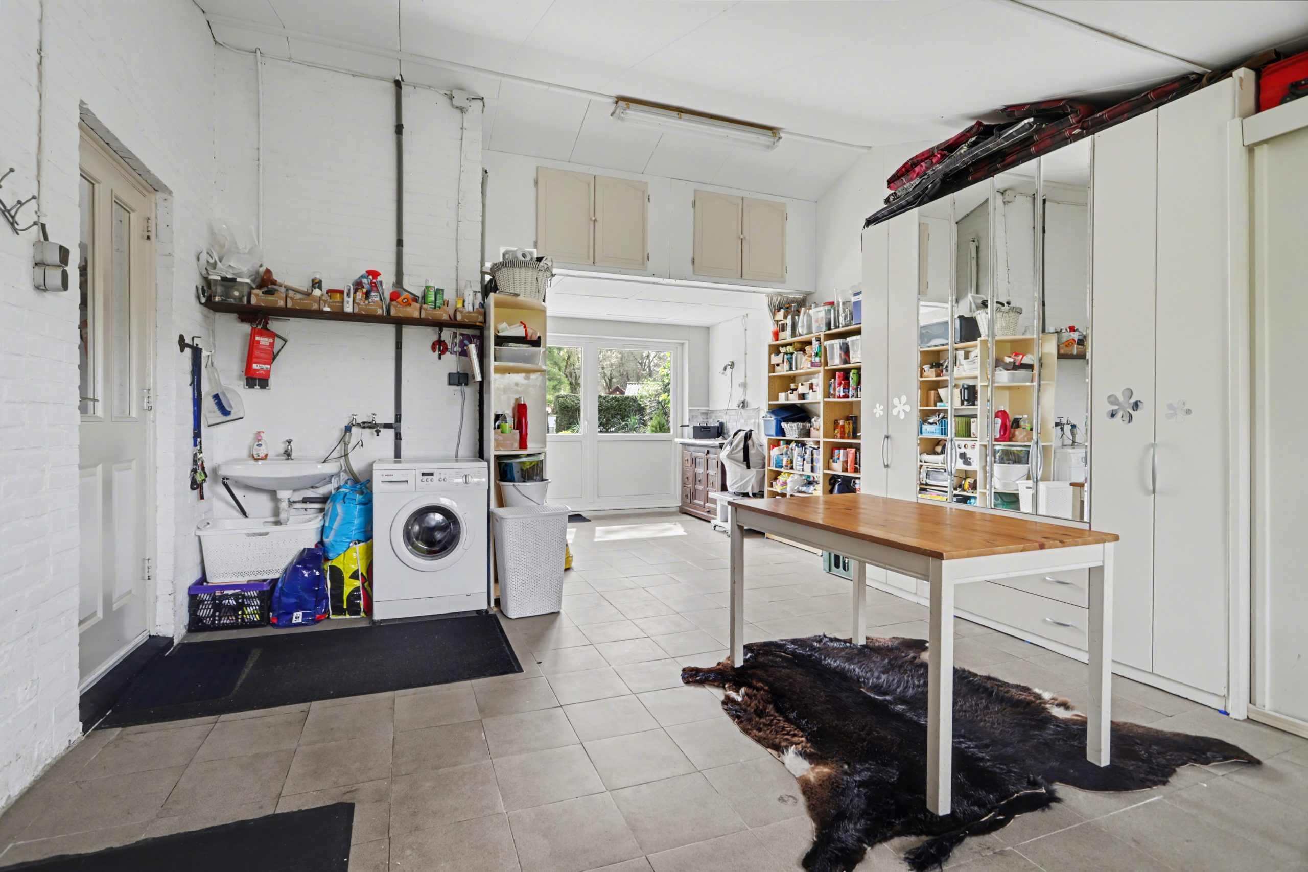 Aangrenzend bevindt zich de voormalige garage, momenteel in gebruik als bijkeuken. Deze ruimte beschikt over aansluitingen voor wasmachine en droger en heeft veel lichtinval dankzij de brede openslaande deuren. Hierdoor is de ruimte eenvoudig weer als garage te gebruiken, maar ook geschikt als werk-, hobby- of slaapruimte. Tevens is hier een deur naar de overkapping in de achtertuin.