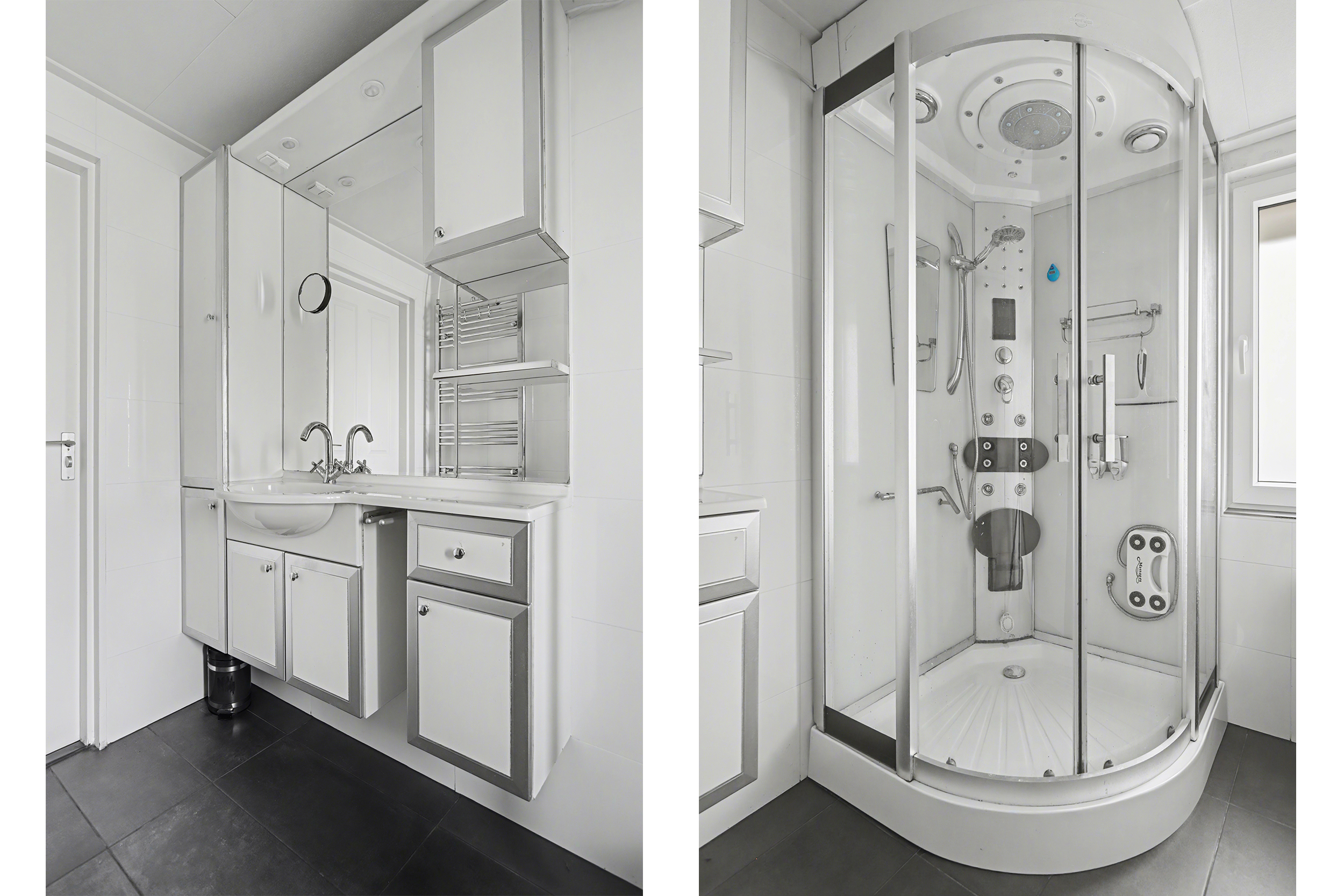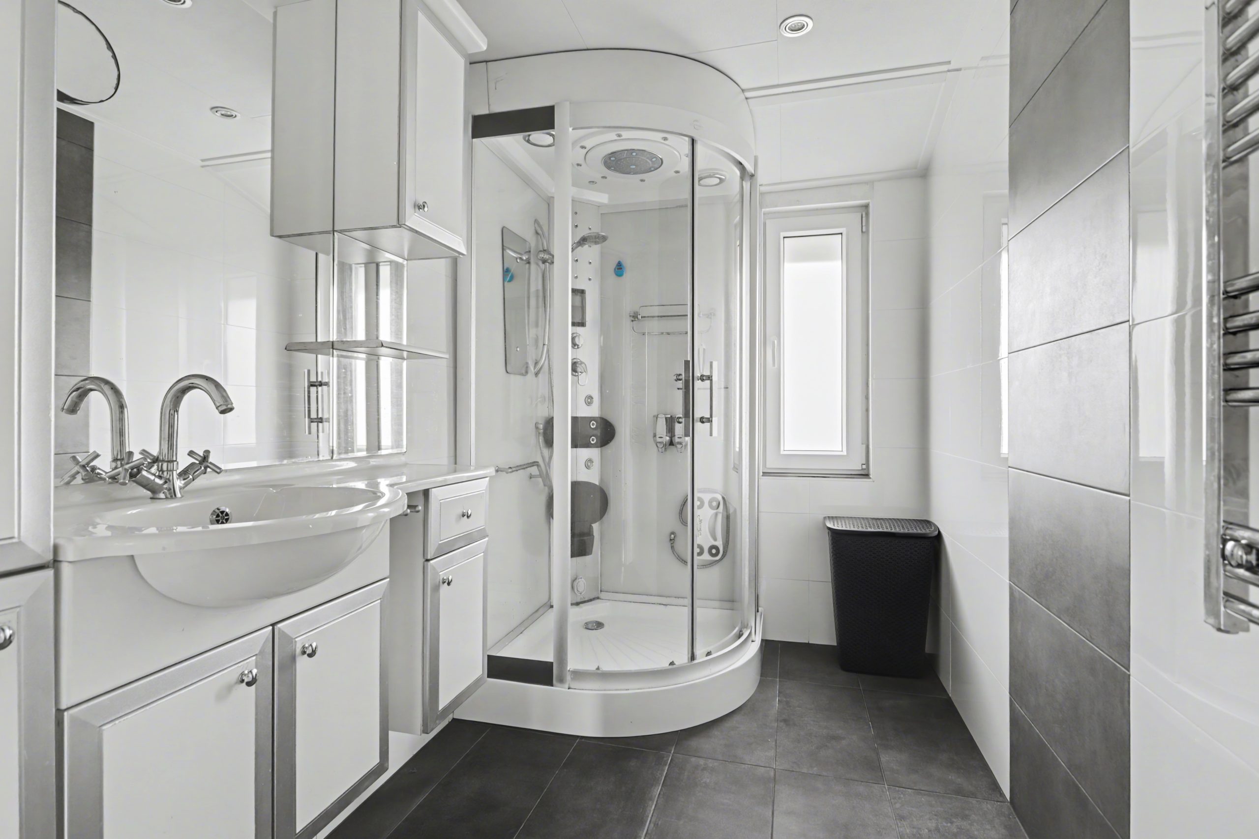 De volledig betegelde badkamer is modern uitgevoerd met een badmeubel en een luxe douchecabine met zowel massage- als stoomfunctie.