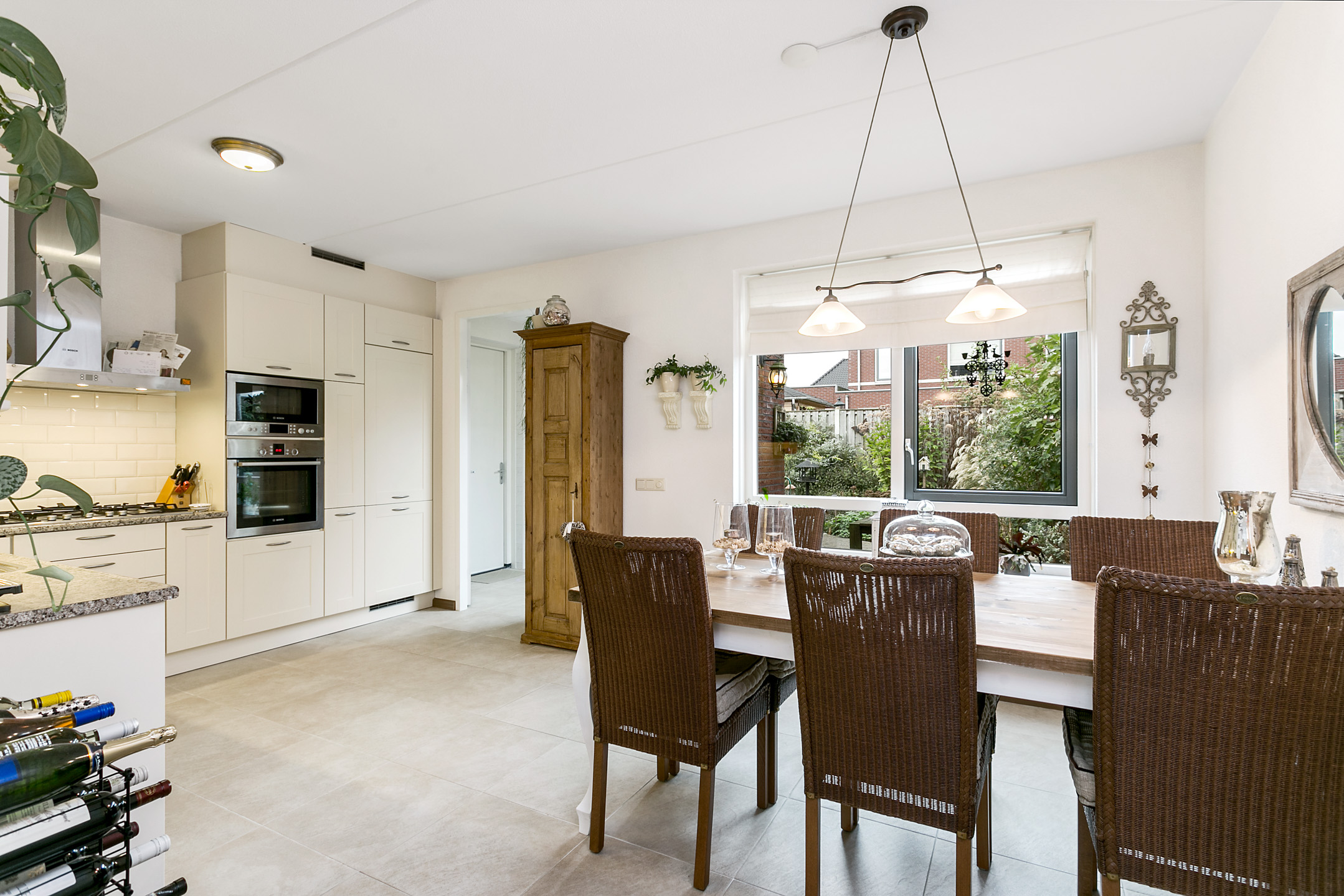 De moderne keuken (circa 21 m²) geplaatst in 2008 met uitzicht op de tuin heeft lichte plavuizen vloer met vloerverwarming, de keuken heeft inbouwverlichting, stucwerk wanden en een gespoten plafond. De keukeninrichting is voorzien van een close-inboiler, spoelbak met een kraan en combi/ magnetron/oven, vaatwasser, koelkast, vrieskast en boven het 5 pits gasfornuis een dampkap geplaatst. De ruime opstelling van de keukeninrichting zorgt voor meer dan voldoende bergruimte.