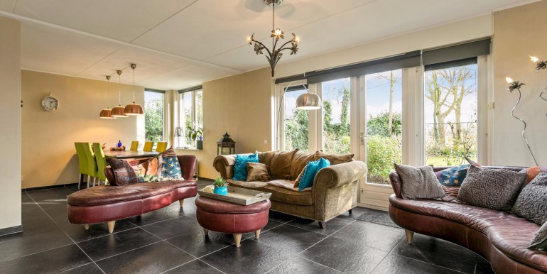De woonkamer (32 m2) is voorzien van glasweefsel wandafwerking en spuitwerk plafond en heeft een plavuizenvloer. Via de openslaande deuren aan de achterkant en zijkant heeft u toegang tot de ruime tuin.