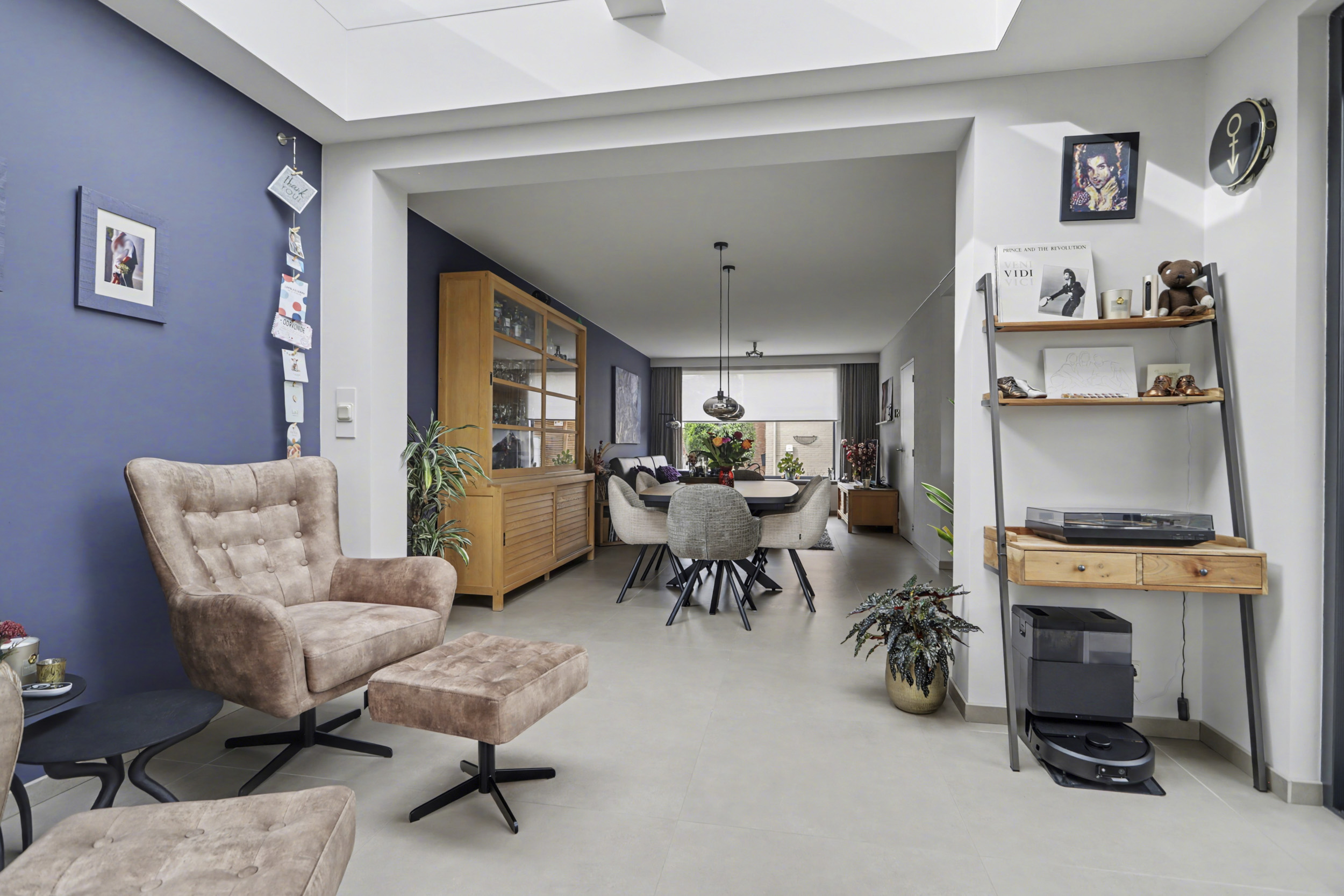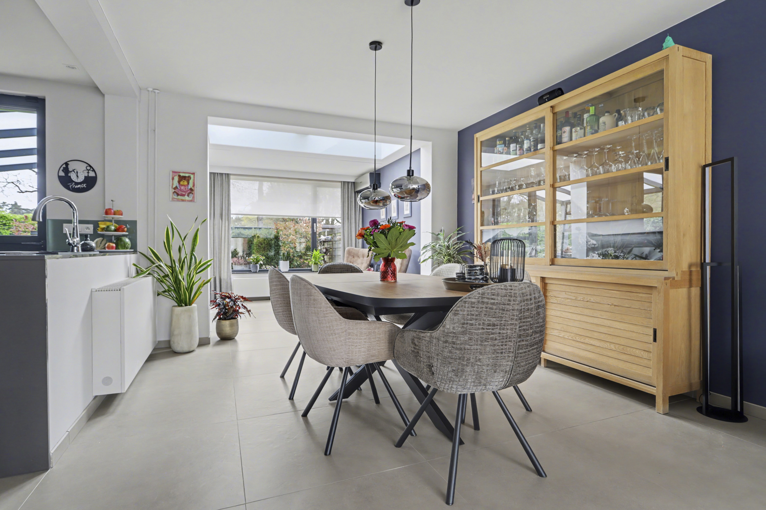 De begane grond is stijlvol afgewerkt met een plavuizen vloer, strak stucwerk en een royale, uitgebouwde woonkamer. Dankzij de lichtstraat en schuifpui profiteer je van veel natuurlijk licht en een directe verbinding met de tuin. De moderne keuken is compleet uitgerust met een composiet werkblad en diverse inbouwapparatuur, waardoor koken hier een plezier wordt.