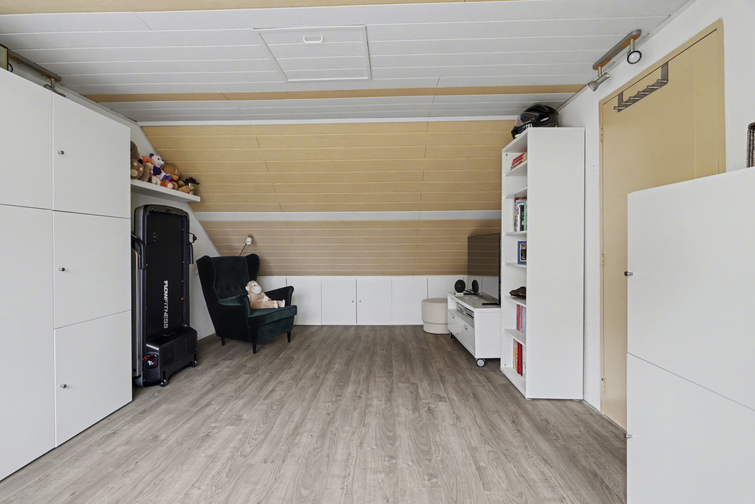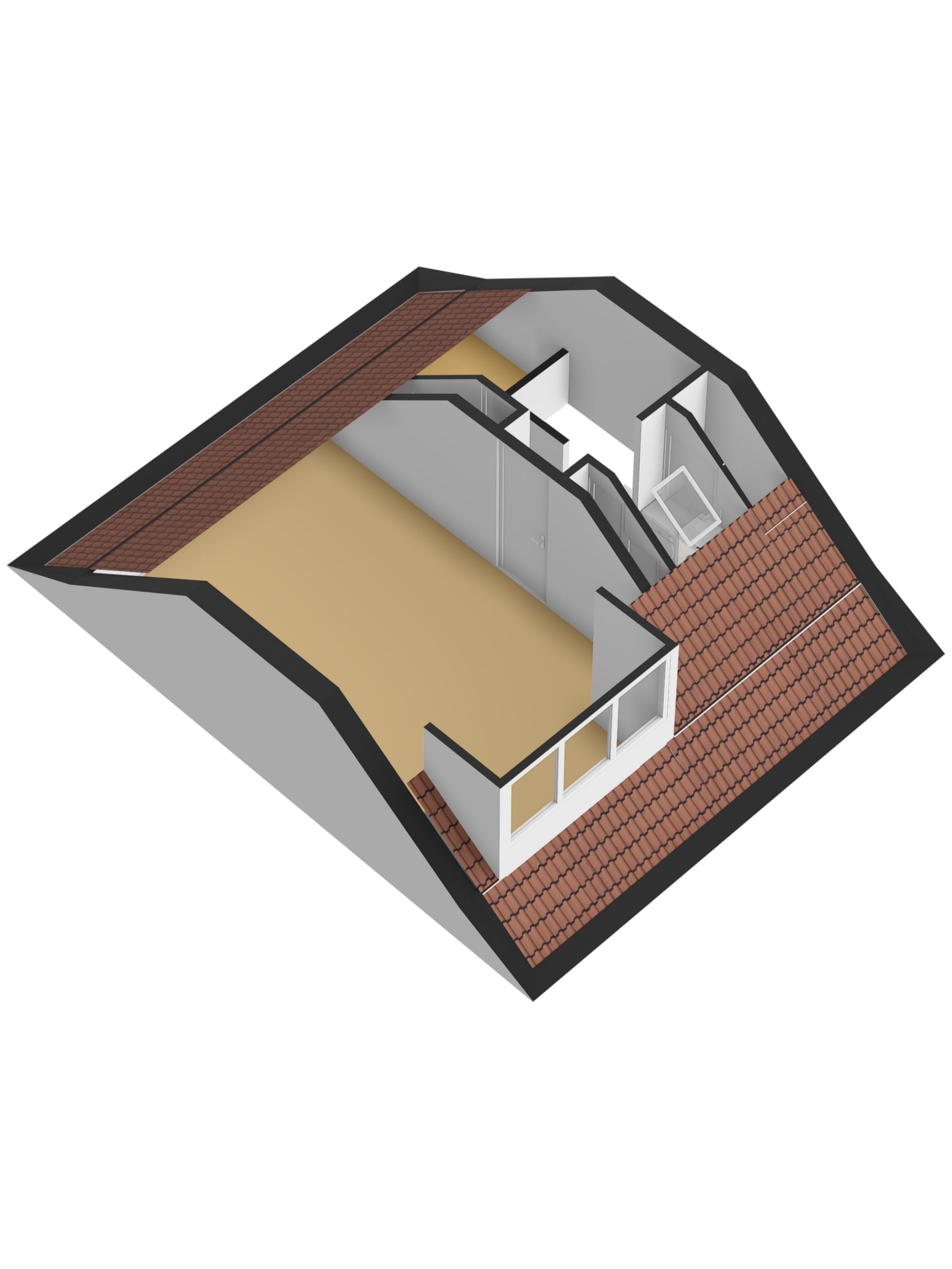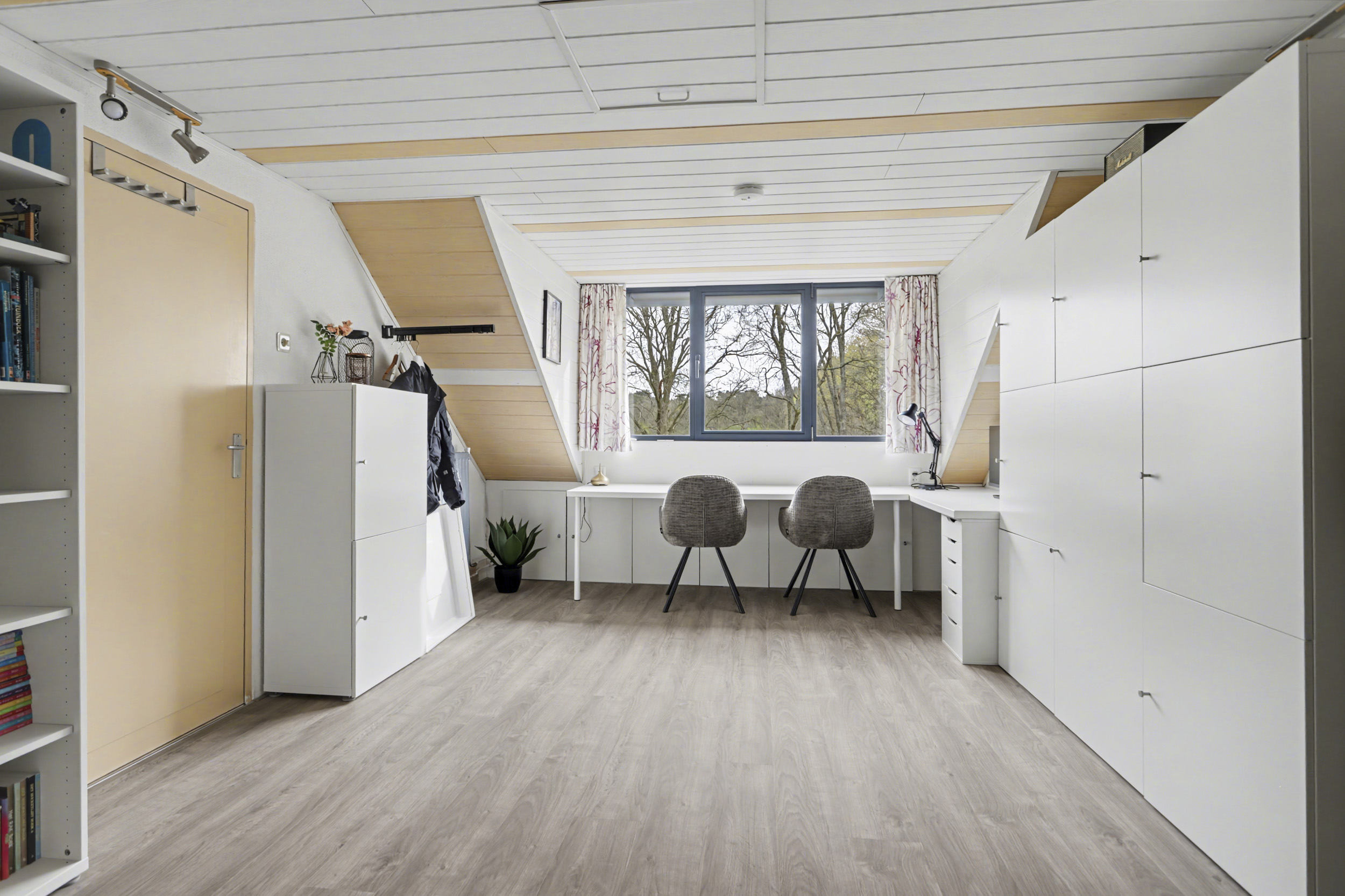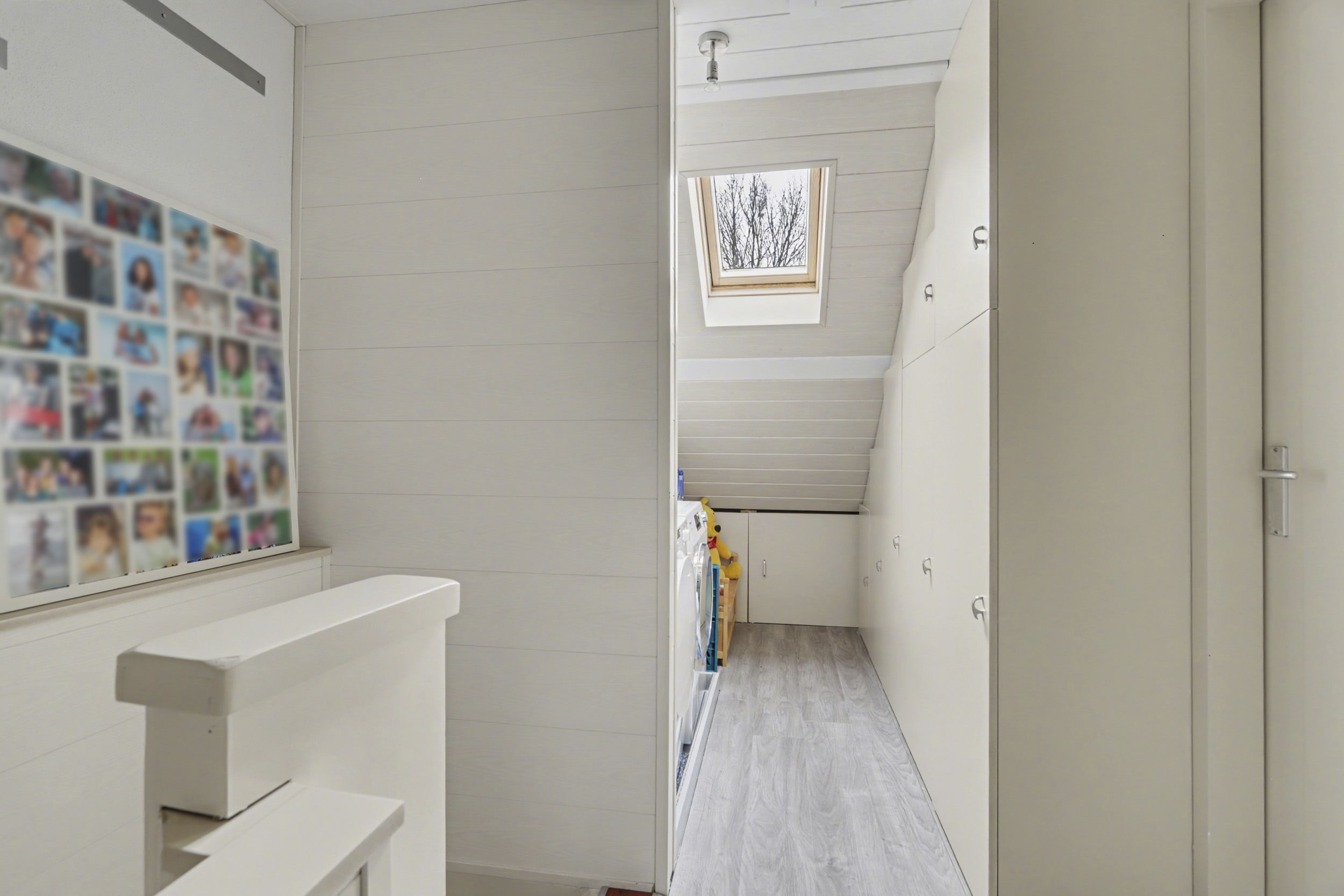 De tweede verdieping, bereikbaar via een vaste trap, biedt een volwaardige vierde slaapkamer. Deze ruimte is perfect als master bedroom of multifunctionele kamer en beschikt over een Velux dakraam en goede isolatie. Op de voorzolder vind je de cv-installatie en aansluitingen voor witgoed apparatuur.