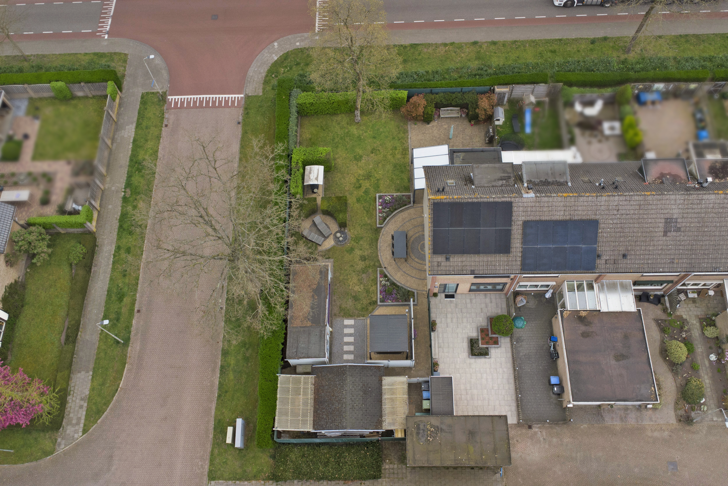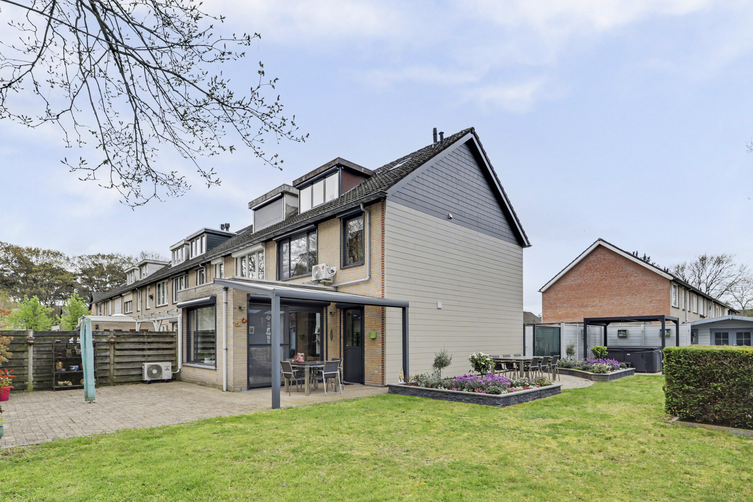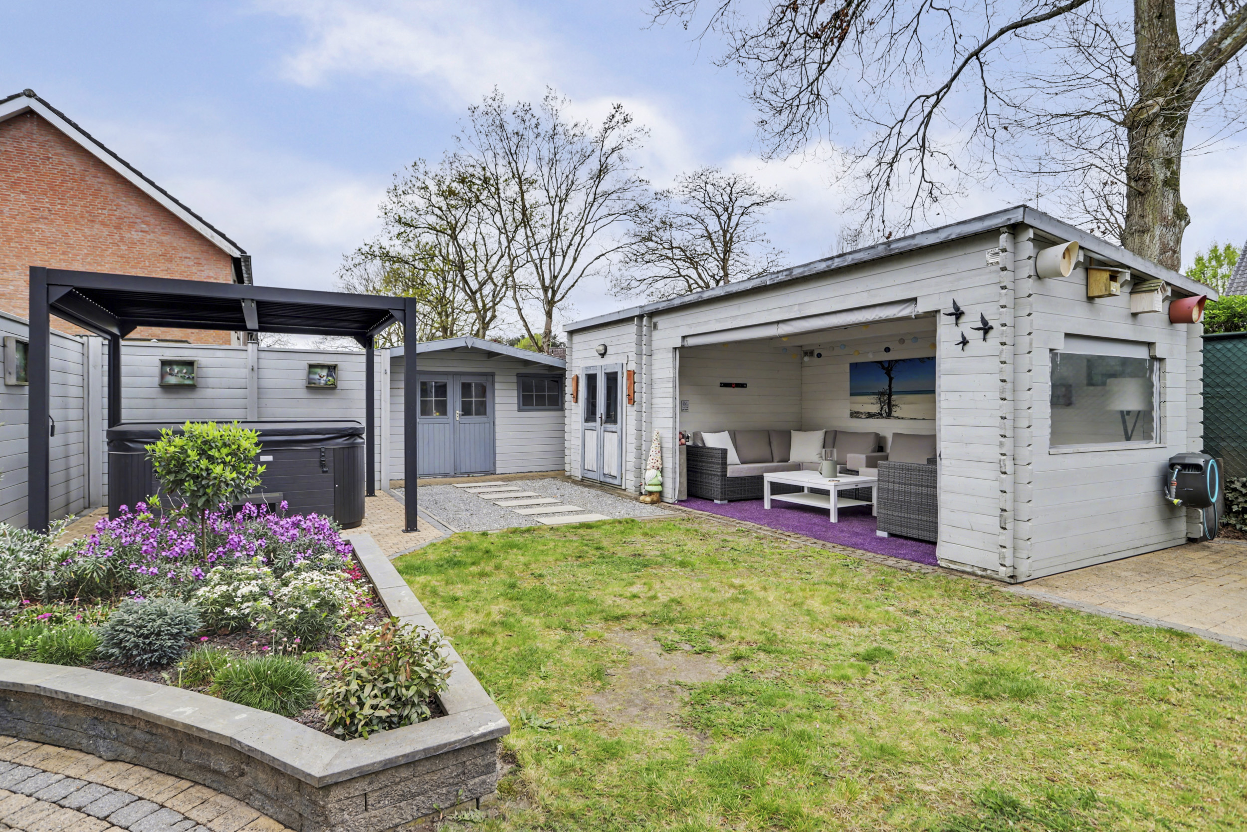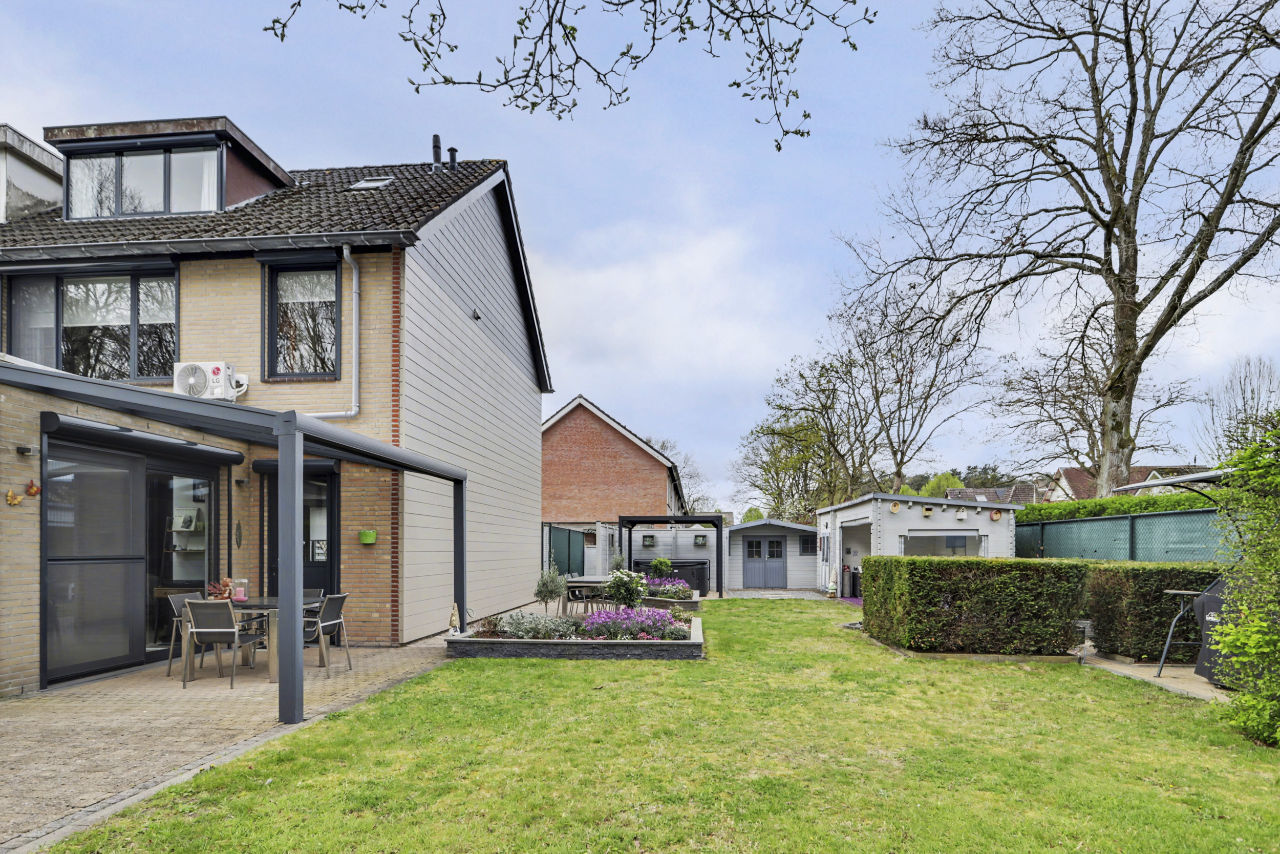 De zonnige achtertuin op het westen biedt veel privacy en is verzorgd aangelegd met een combinatie van terras, gazon en bestrating. De grote houten overkapping maakt het mogelijk om het hele jaar door buiten te genieten. Daarnaast beschikt de woning over een houten berging én een vrijstaande garage.