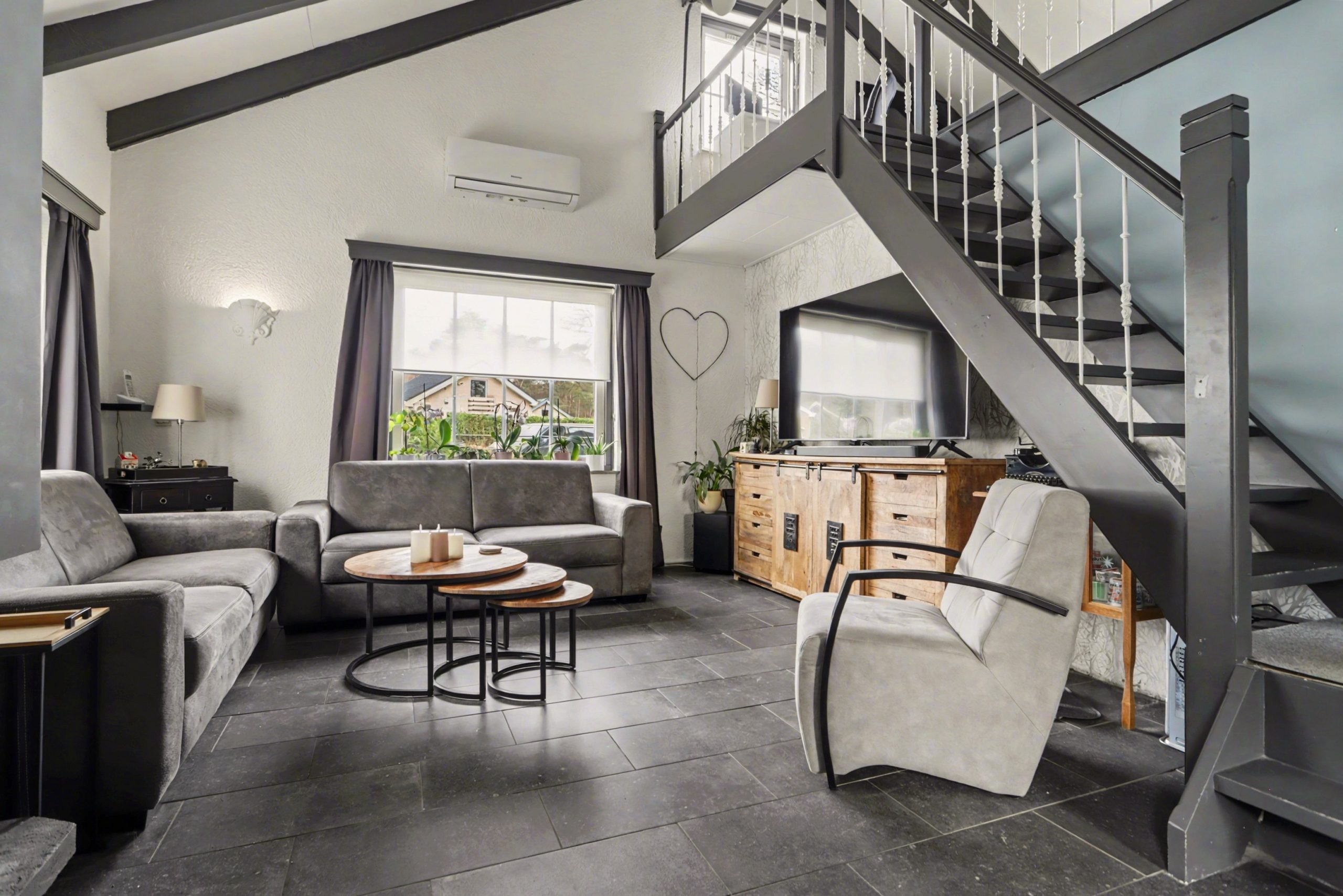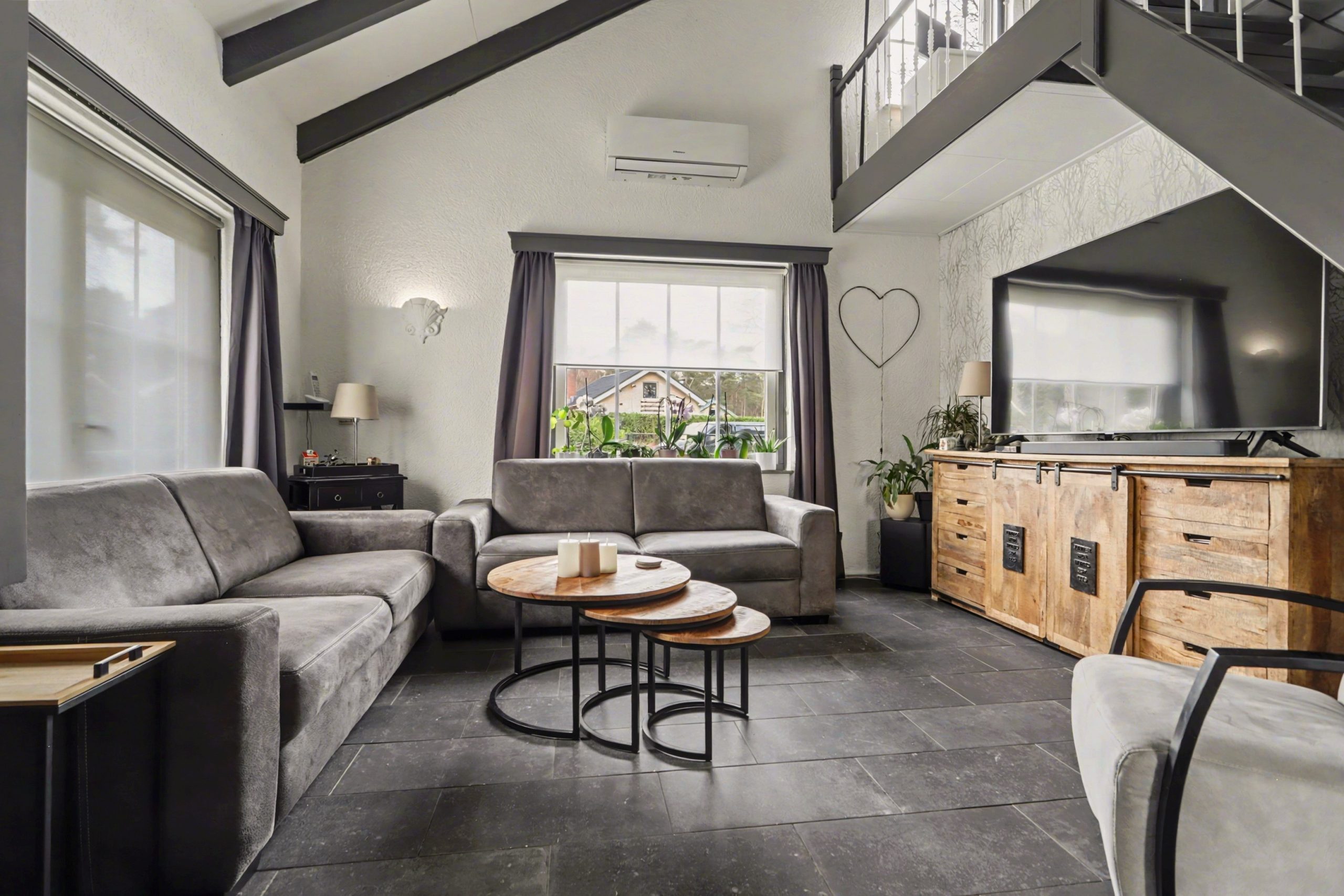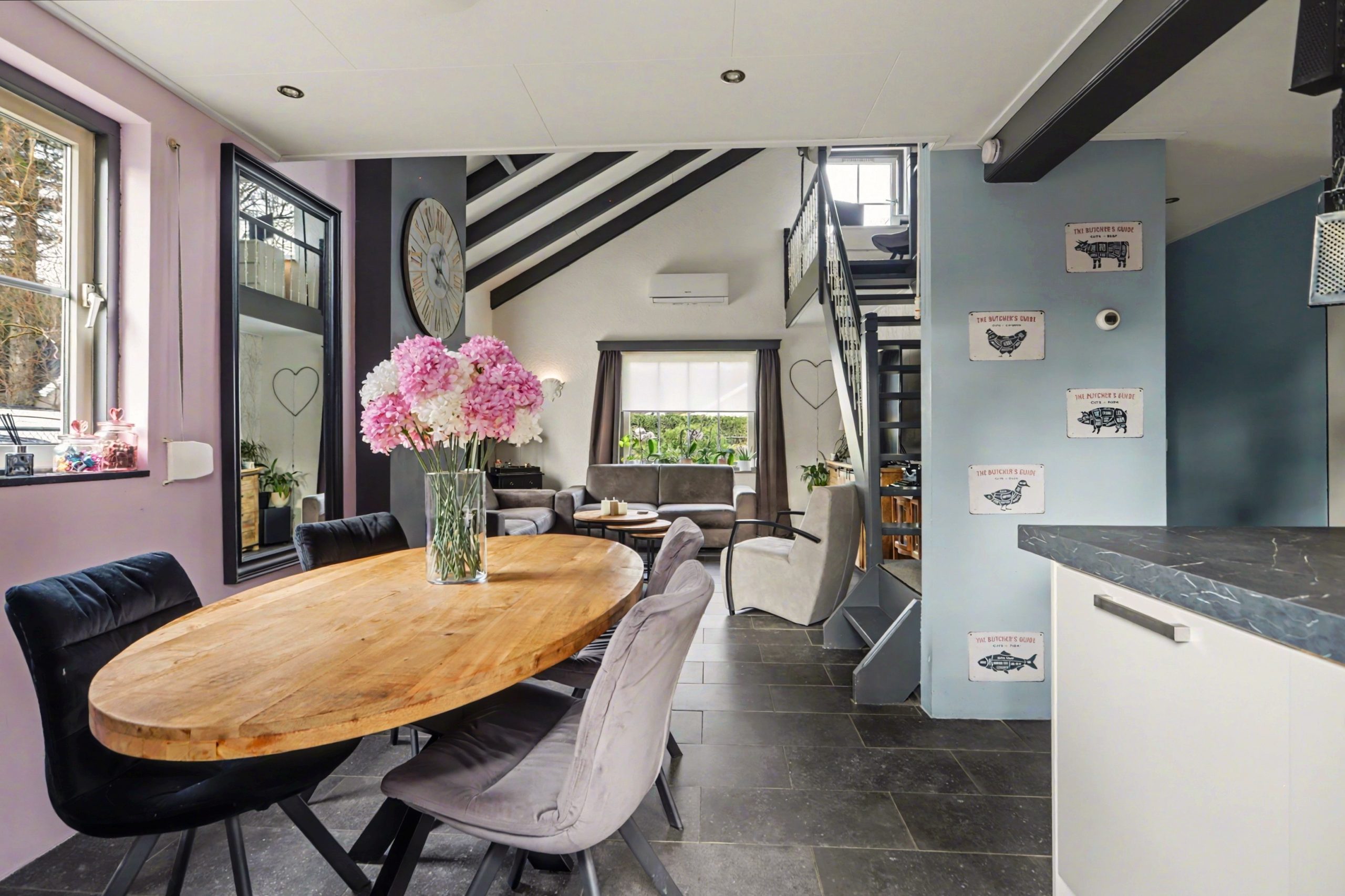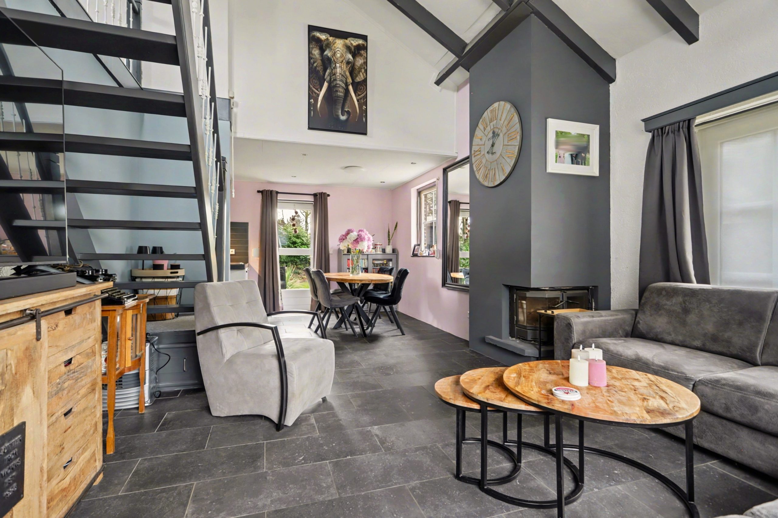 De lichte woonkamer is afgewerkt met een plavuizenvloer met vloerverwarming, strakke wandafwerking en een sfeervolle inbouwhaard. Het plafond met zichtbare balken en gedeeltelijke inbouwverlichting geeft de ruimte een warme uitstraling. Via de openslaande deuren bereikt u de tuin.