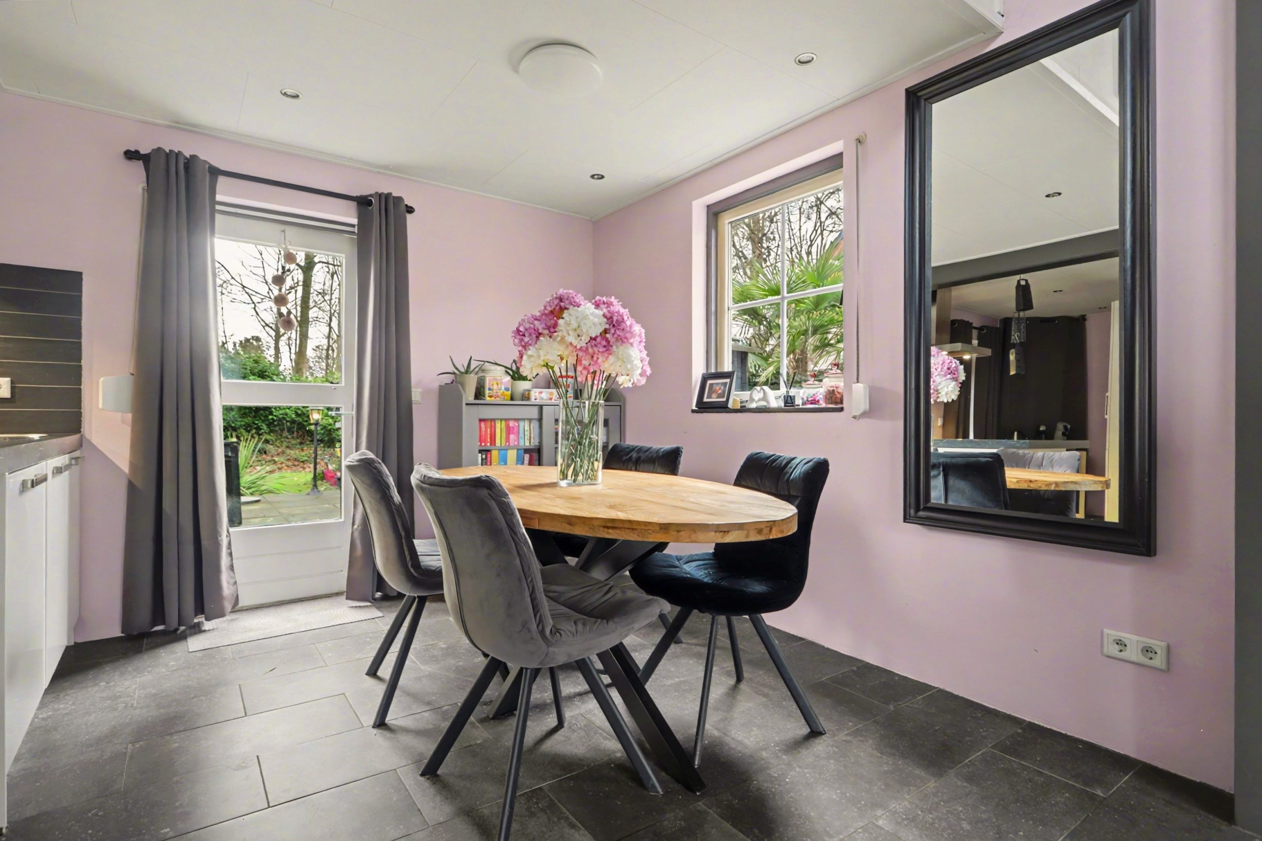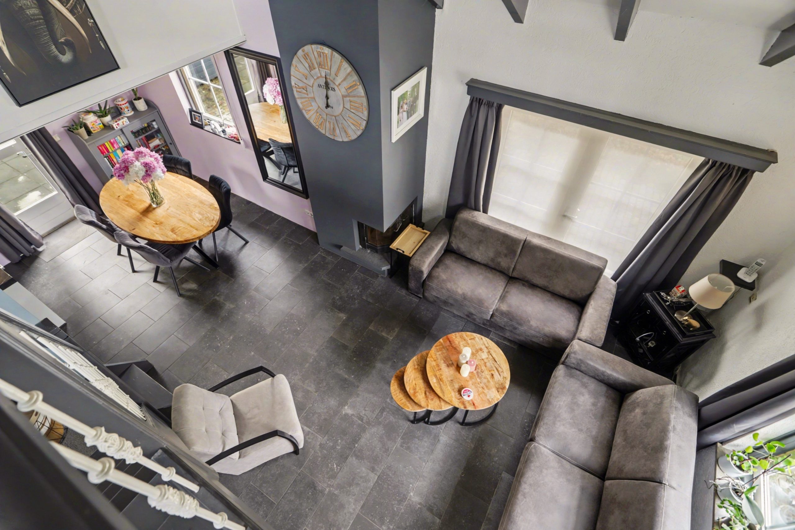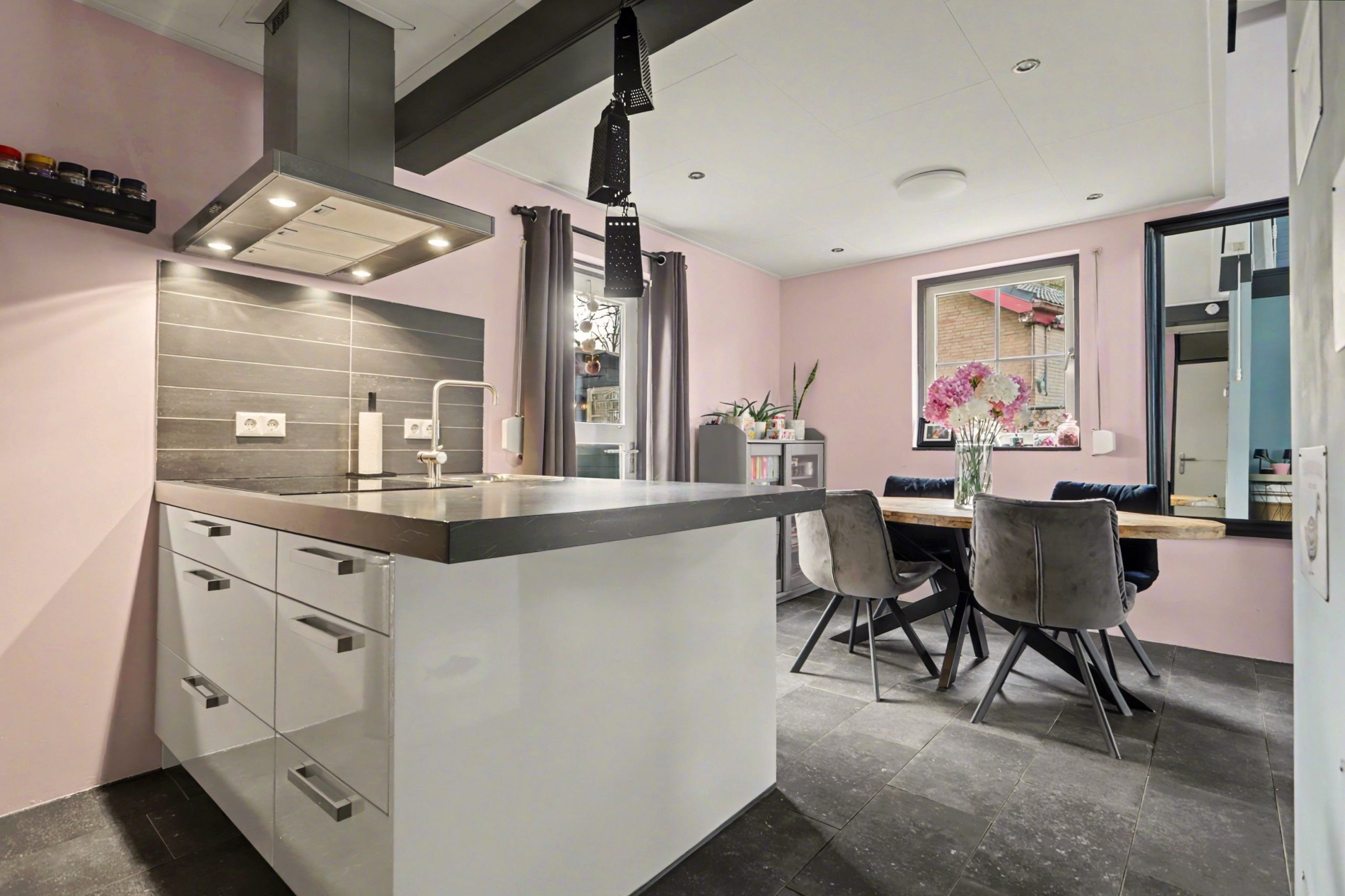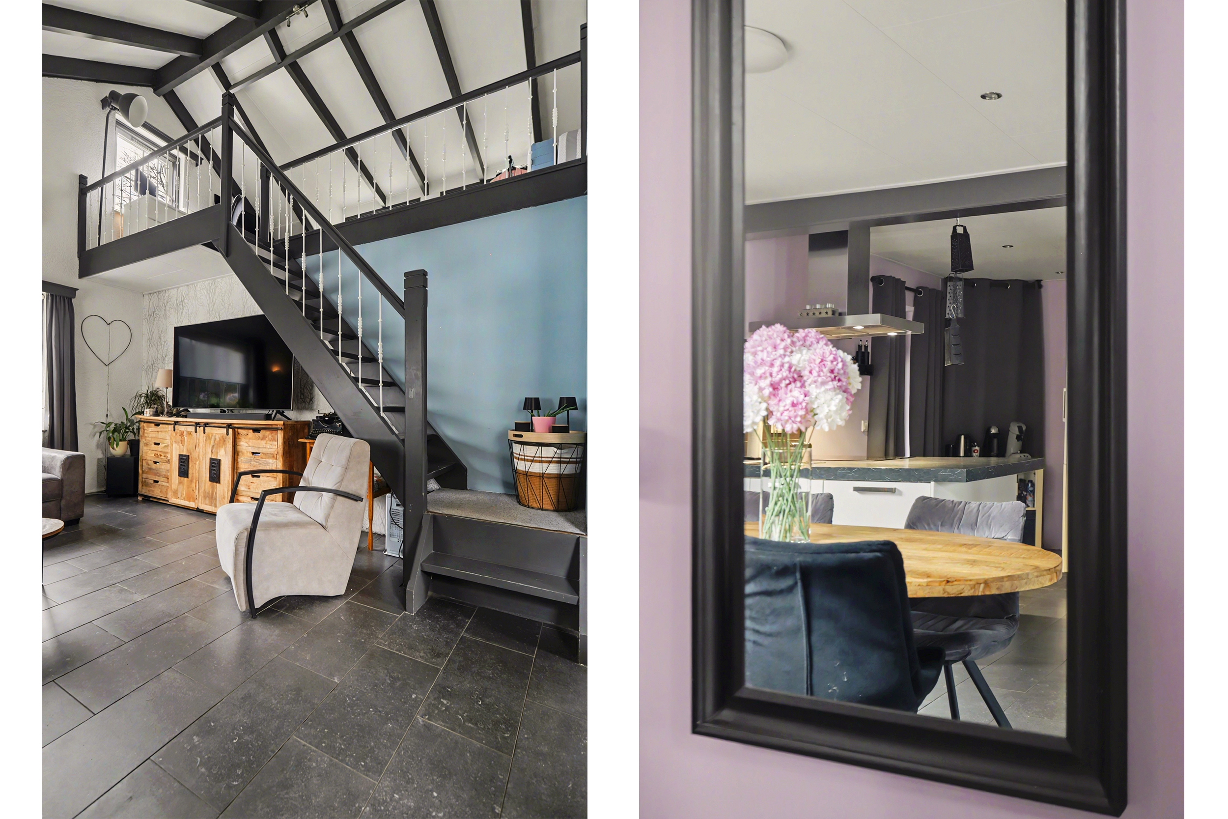 De lichte woonkamer is afgewerkt met een plavuizenvloer met vloerverwarming, strakke wandafwerking en een sfeervolle inbouwhaard. Het plafond met zichtbare balken en gedeeltelijke inbouwverlichting geeft de ruimte een warme uitstraling. Via de openslaande deuren bereikt u de tuin.