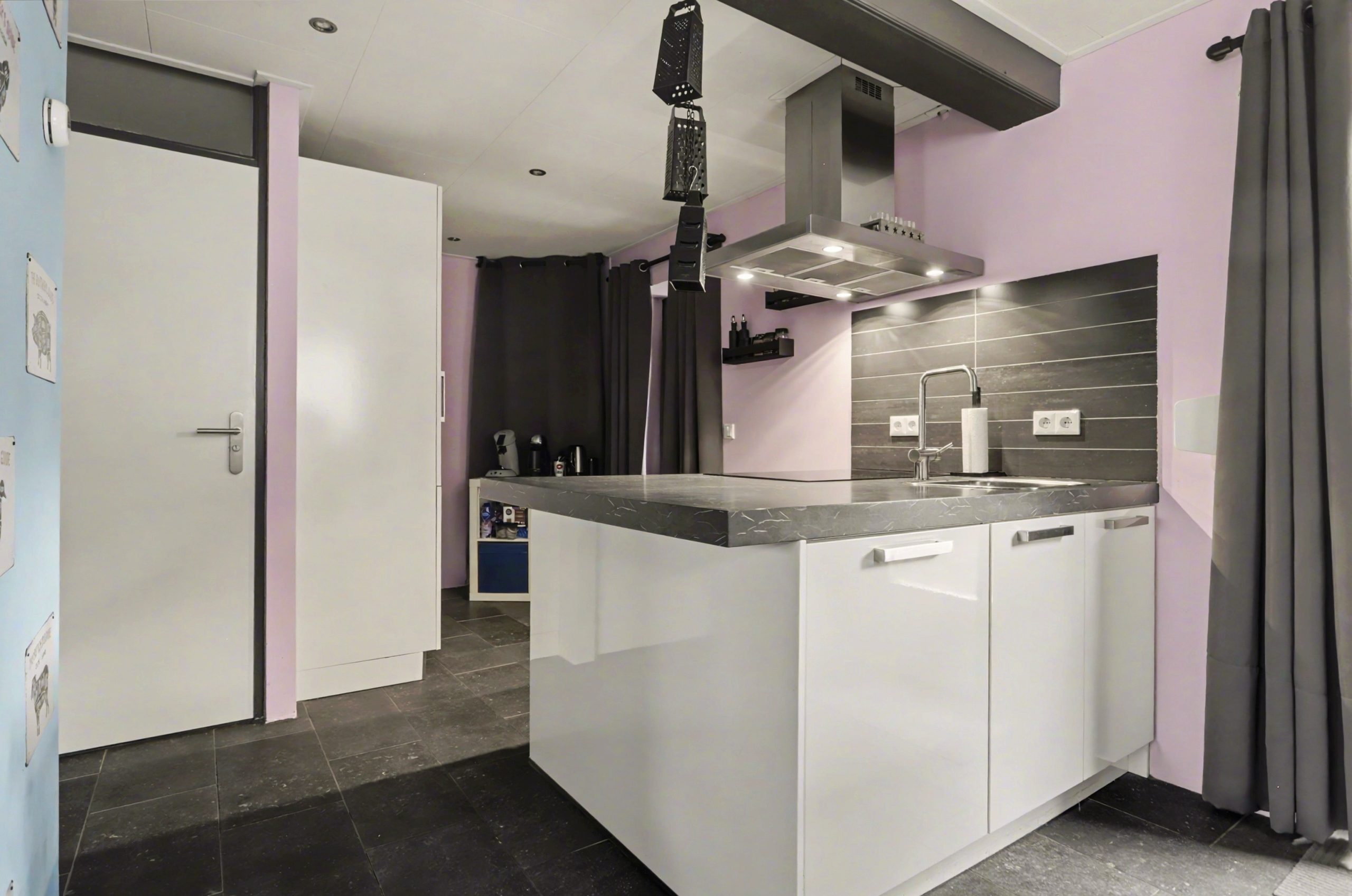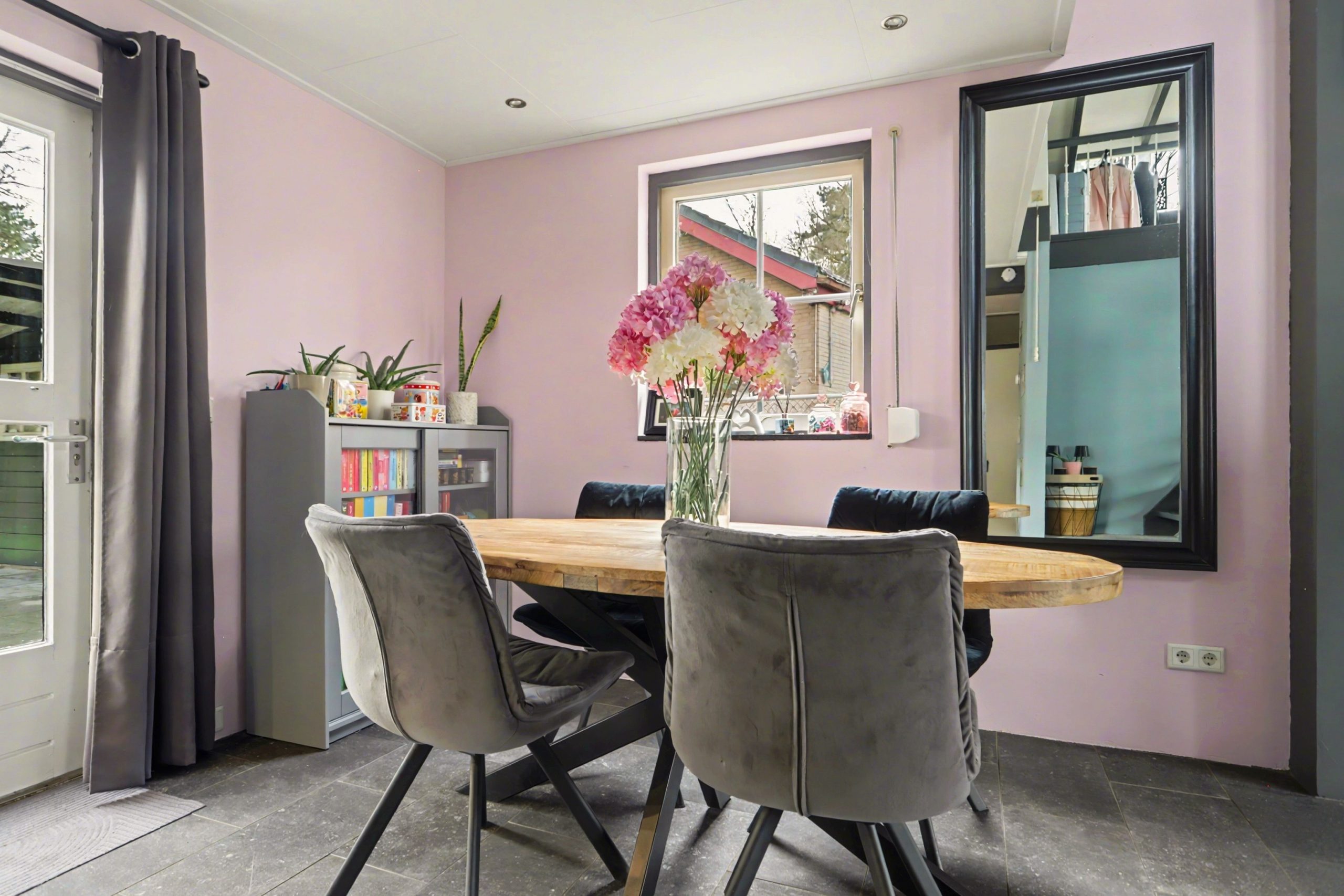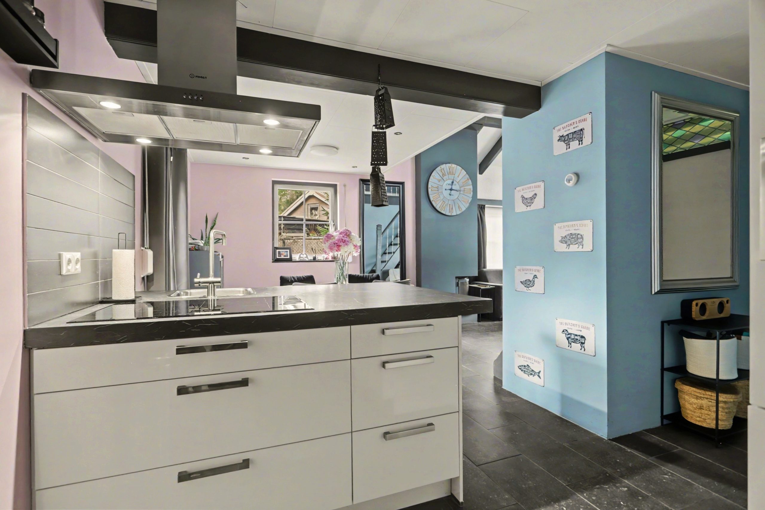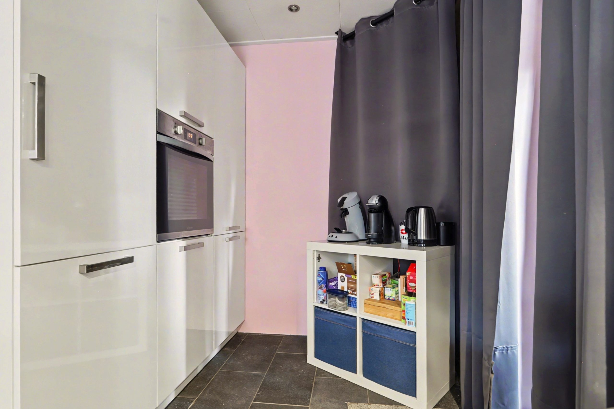 De lichte woonkamer is afgewerkt met een plavuizenvloer met vloerverwarming, strakke wandafwerking en een sfeervolle inbouwhaard. Het plafond met zichtbare balken en gedeeltelijke inbouwverlichting geeft de ruimte een warme uitstraling. Via de openslaande deuren bereikt u de tuin.