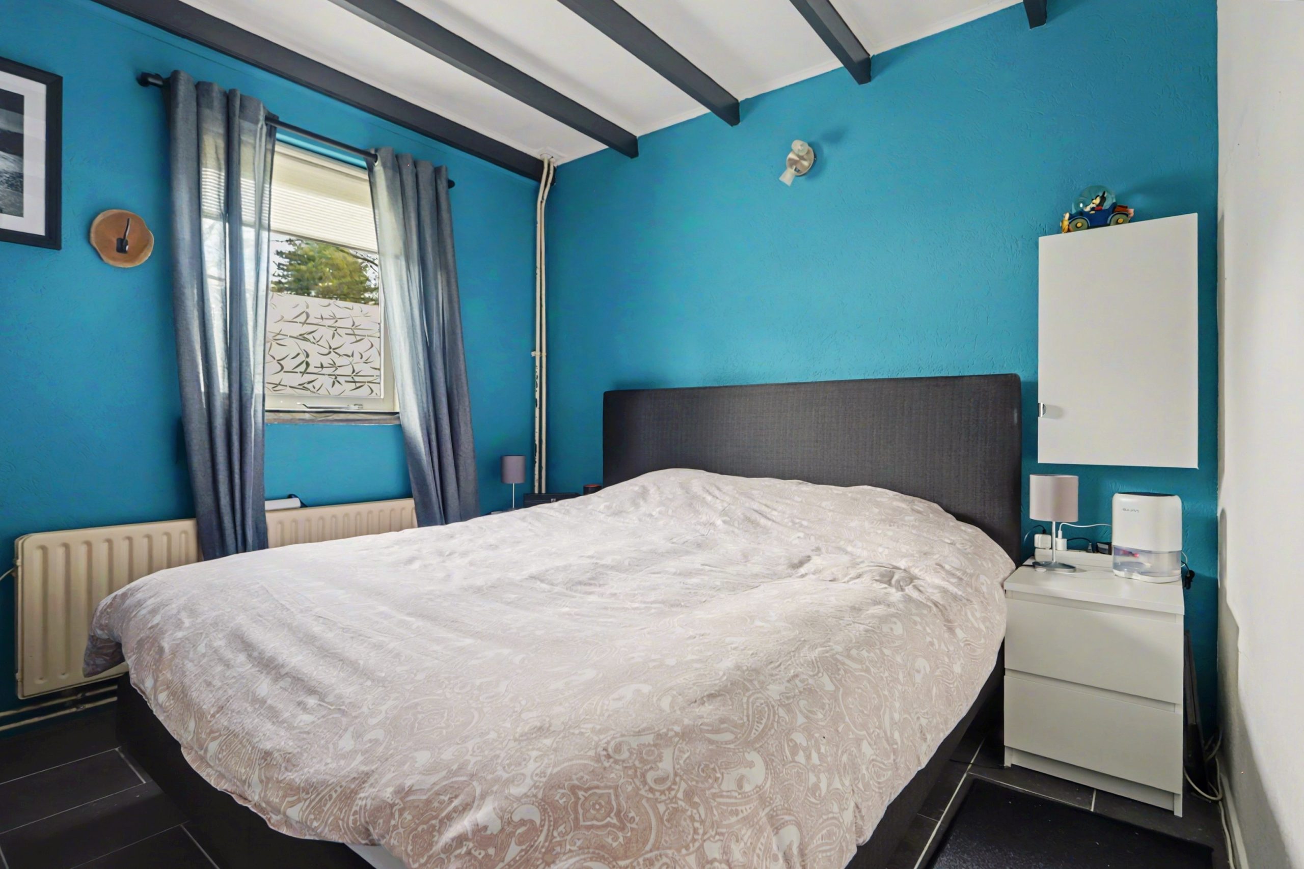 Op de begane grond bevindt zich tevens één slaapkamer met gesauste wanden, houten kozijnen met dubbele beglazing en een rolluik. De kamer is afgewerkt met een plavuizenvloer.