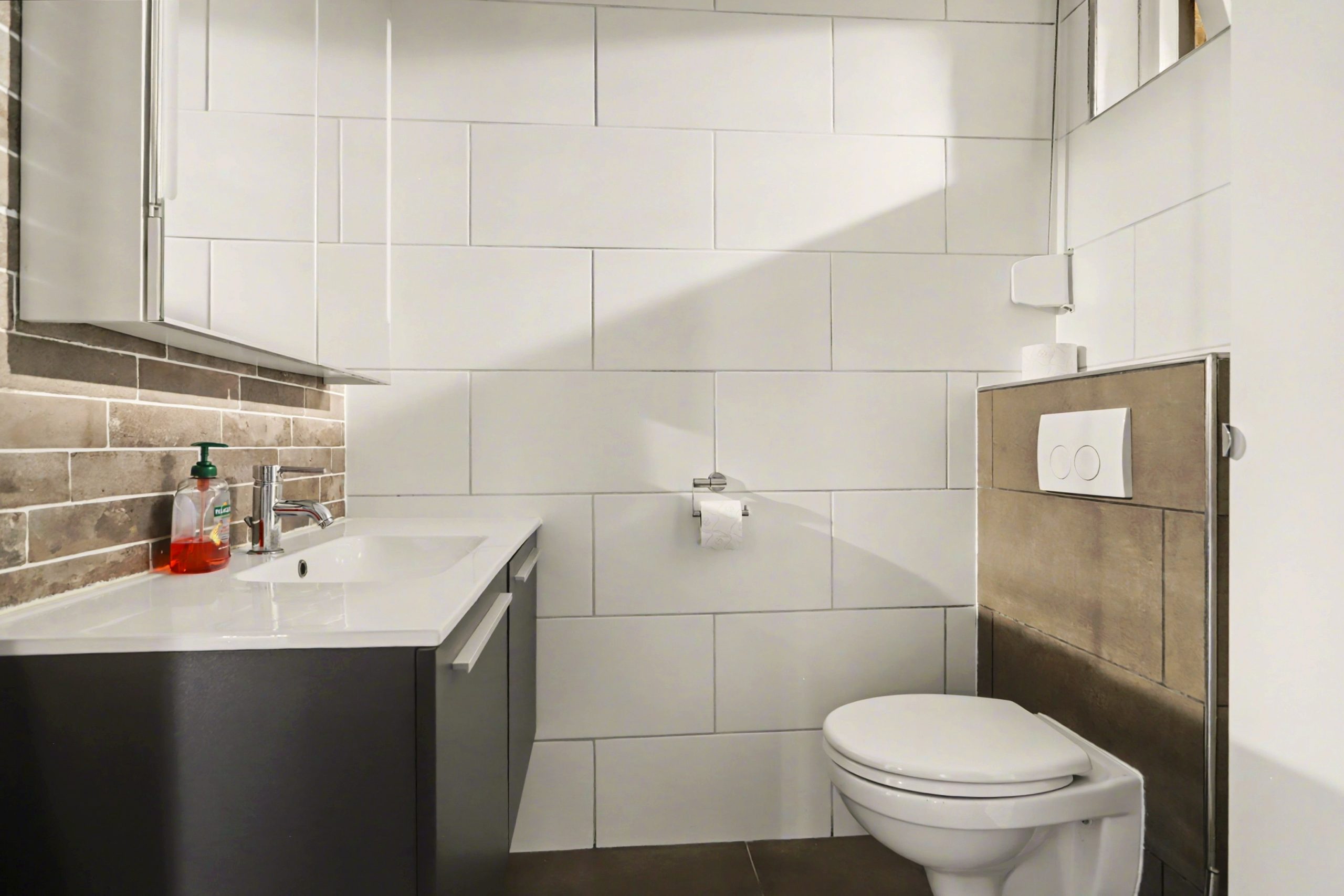 De moderne badkamer is volledig betegeld en voorzien van een douche, een badkamermeubel met wastafel, een zwevend toilet en een radiator voor het verwarmen van handdoeken. Natuurlijke ventilatie wordt verzorgd via een raam.