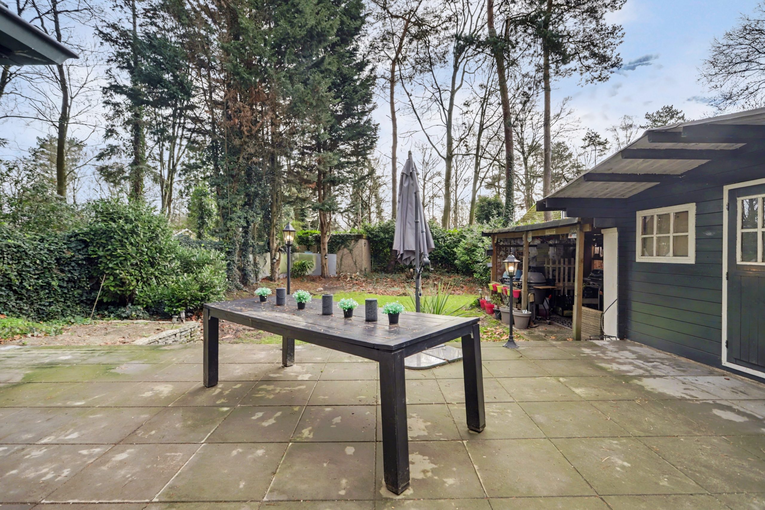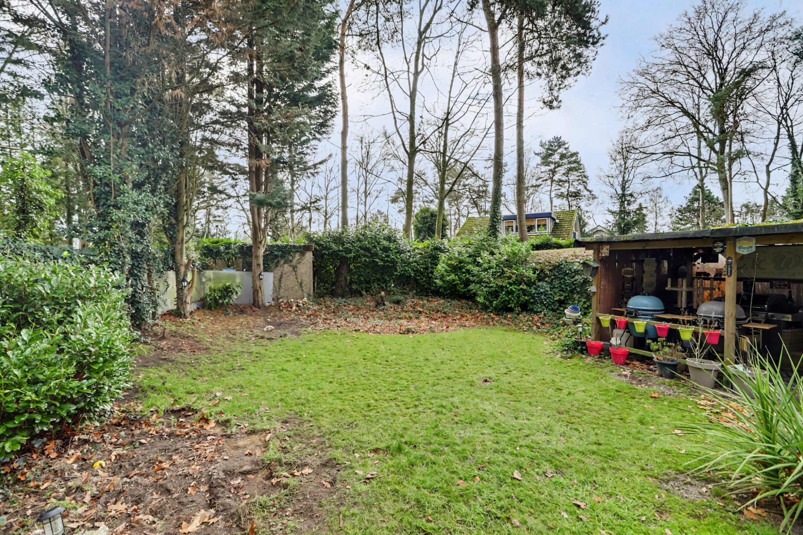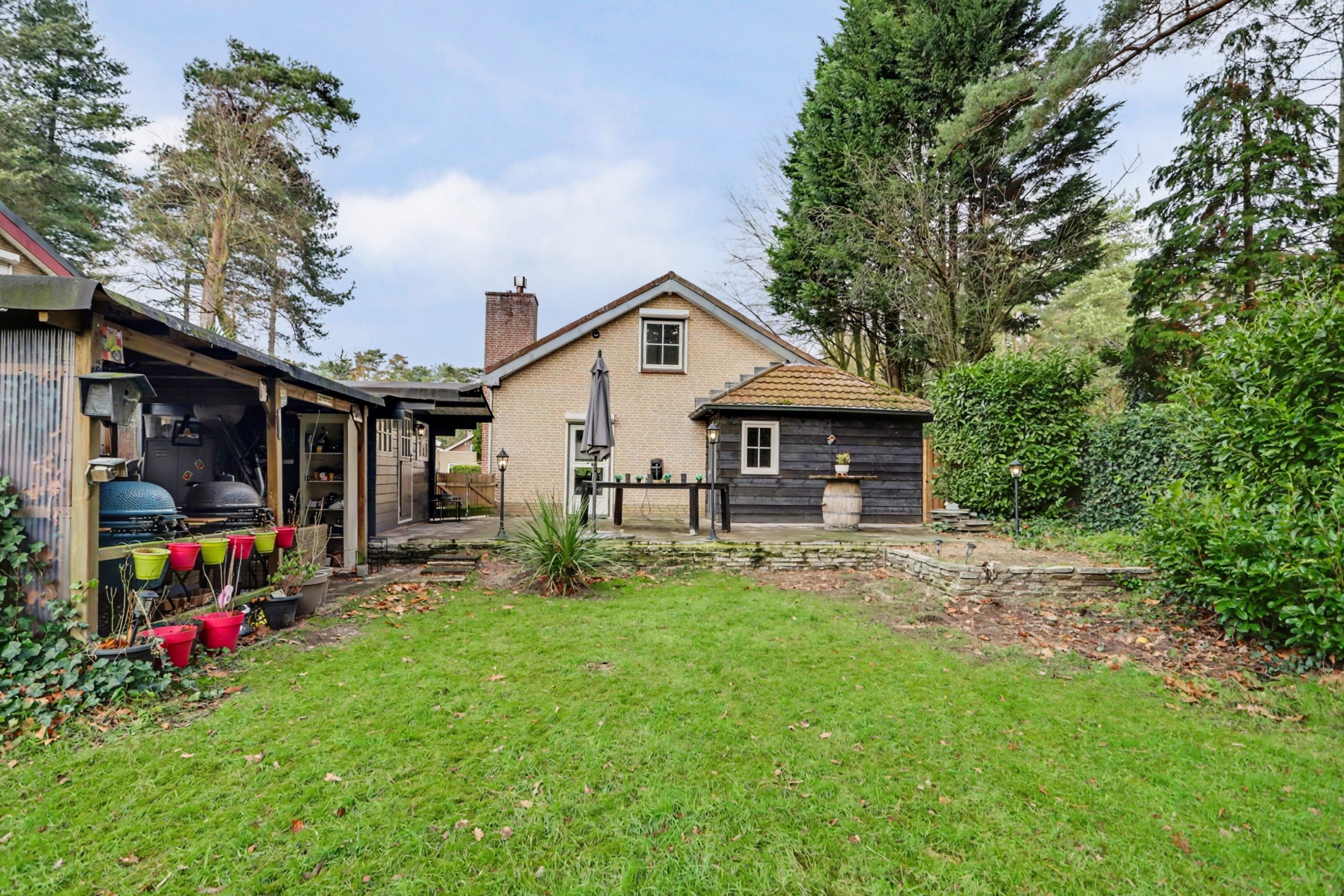 Het perceel is toegankelijk via een smeedijzeren hek aan de voorzijde met oprit. Aan de achterzijde bevindt zich een ruim terras en een vrijstaande overkapping met berging, ideaal om gezellig te barbecueën.