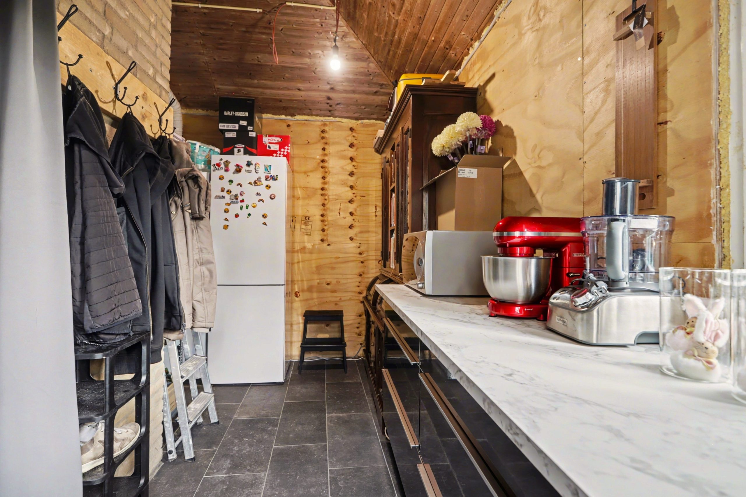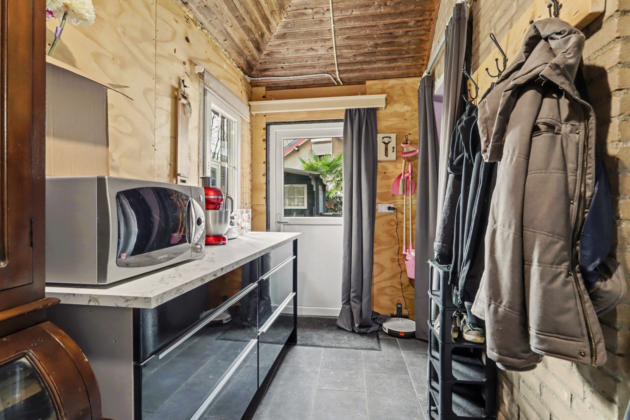 Zoals in Brabant gebruikelijk, betreedt u de recreatiewoning via de achterdeur en komt u direct in de keuken. De open keuken is voorzien van een plavuizenvloer met vloerverwarming, gedeeltelijk betegelde wanden en een verlaagd plafond met inbouwspots. De keukeninrichting beschikt over een aanrechtblad met spoelbak, inductiekookplaat, afzuigkap, oven, vaatwasser en koelkast. Aansluitend bevindt zich de ruime bijkeuken met aansluitingen voor een wasmachine en droger. Vanuit de bijkeuken heeft u directe toegang tot de tuin.
