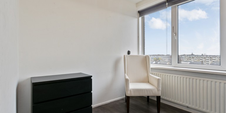 Vanuit de huiskamer is een slaapkamer te bereiken, er is behang wandafwerking laminaat vloer, en een spoten plafond.